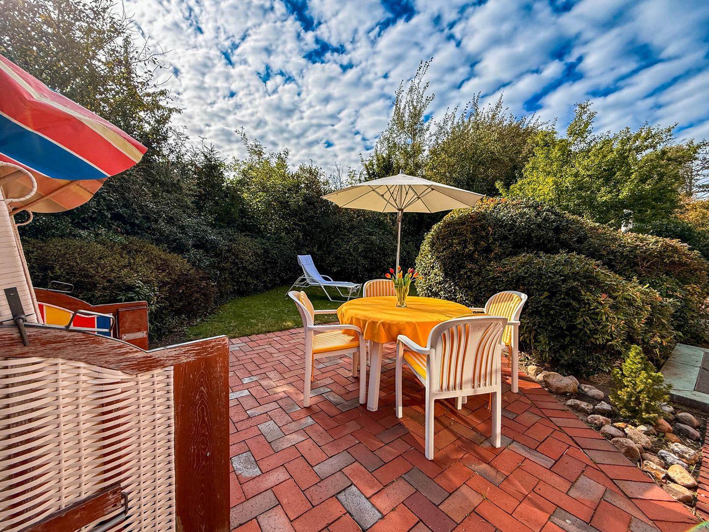 Gemütliche Erdgeschosswohnung mit Terrasse und Strandkorb in Norddorf auf Amrum für einen entspannten Familienurlaub.