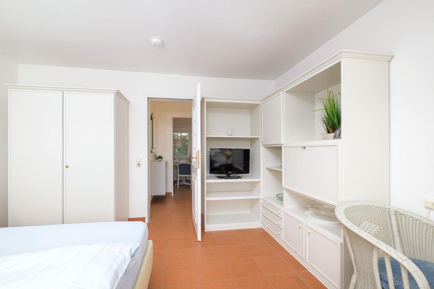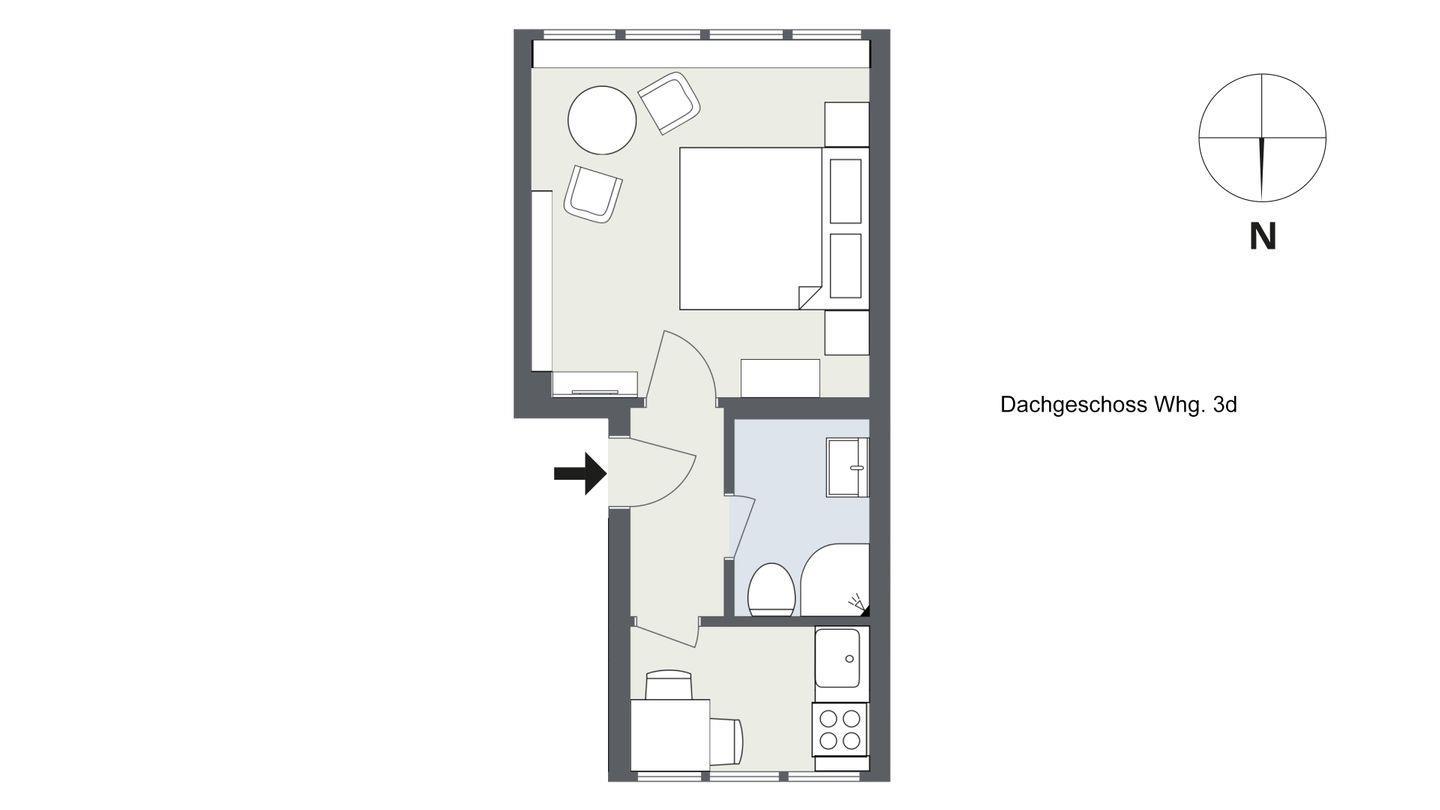 kombiniertes Wohn-/ Schlafzimmer mit Doppelbett, Ku¨che mit Essbereich, Duschbad/ WC
