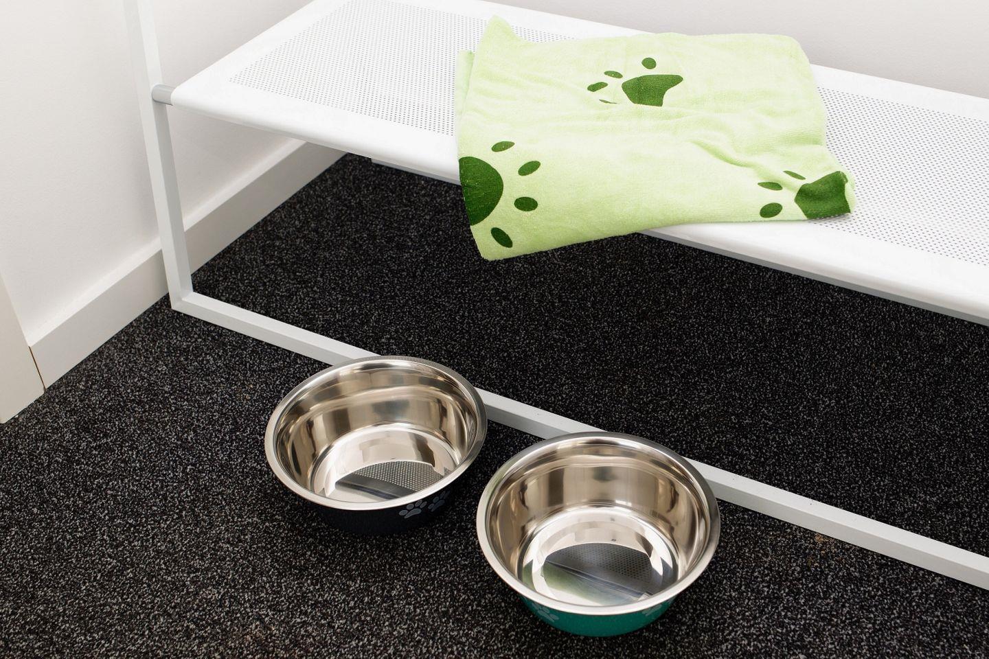 - Fressnäpfe und Handtuch für nasse Pfoten werden bereitgestellt.