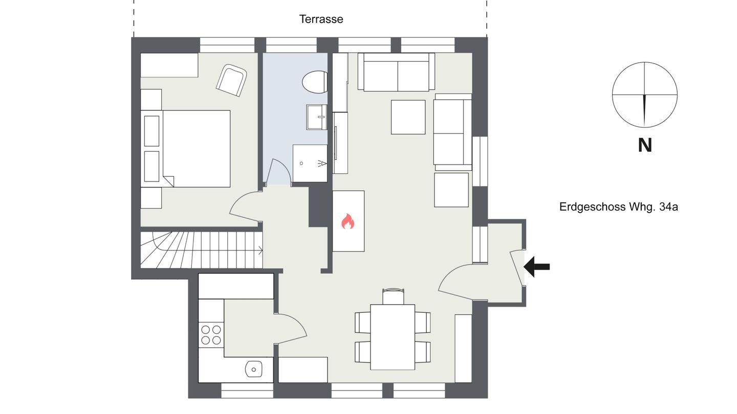 EG: Wohn-/ Esszimmer mit Kamin, Küche, 1 Doppelschlafzimmer, 1 Duschbad/ WC,