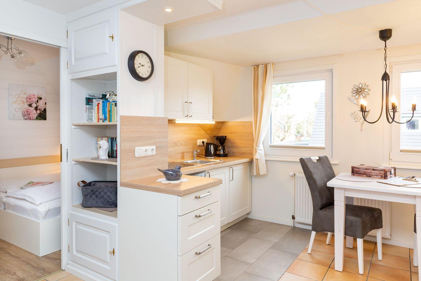 Die Küche ist mit einem 4-Platten-Ceranfeld, einem Backofen, einem Kühlschrank, Eierkocher Toaster, Wasserkocher und Kaffeemaschine ausgestattet. Der Esstisch wurde am Fenster platziert, so dass Sie in den Garten schauen können.