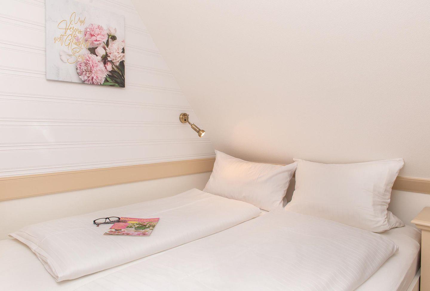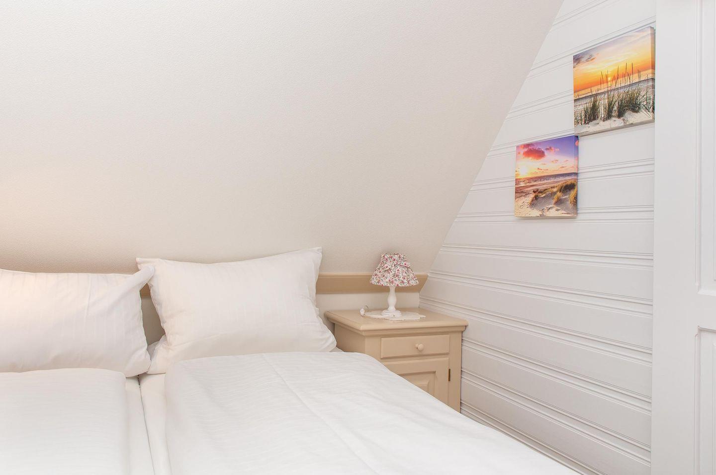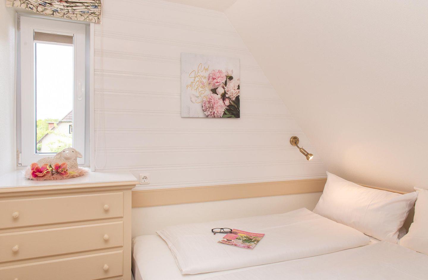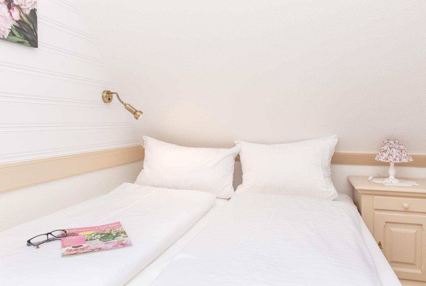Das Schlafzimmer ist gemütlich unter der Dachschräge eingerichtet. Das Doppelbett hat eine Breite von 160 cm.