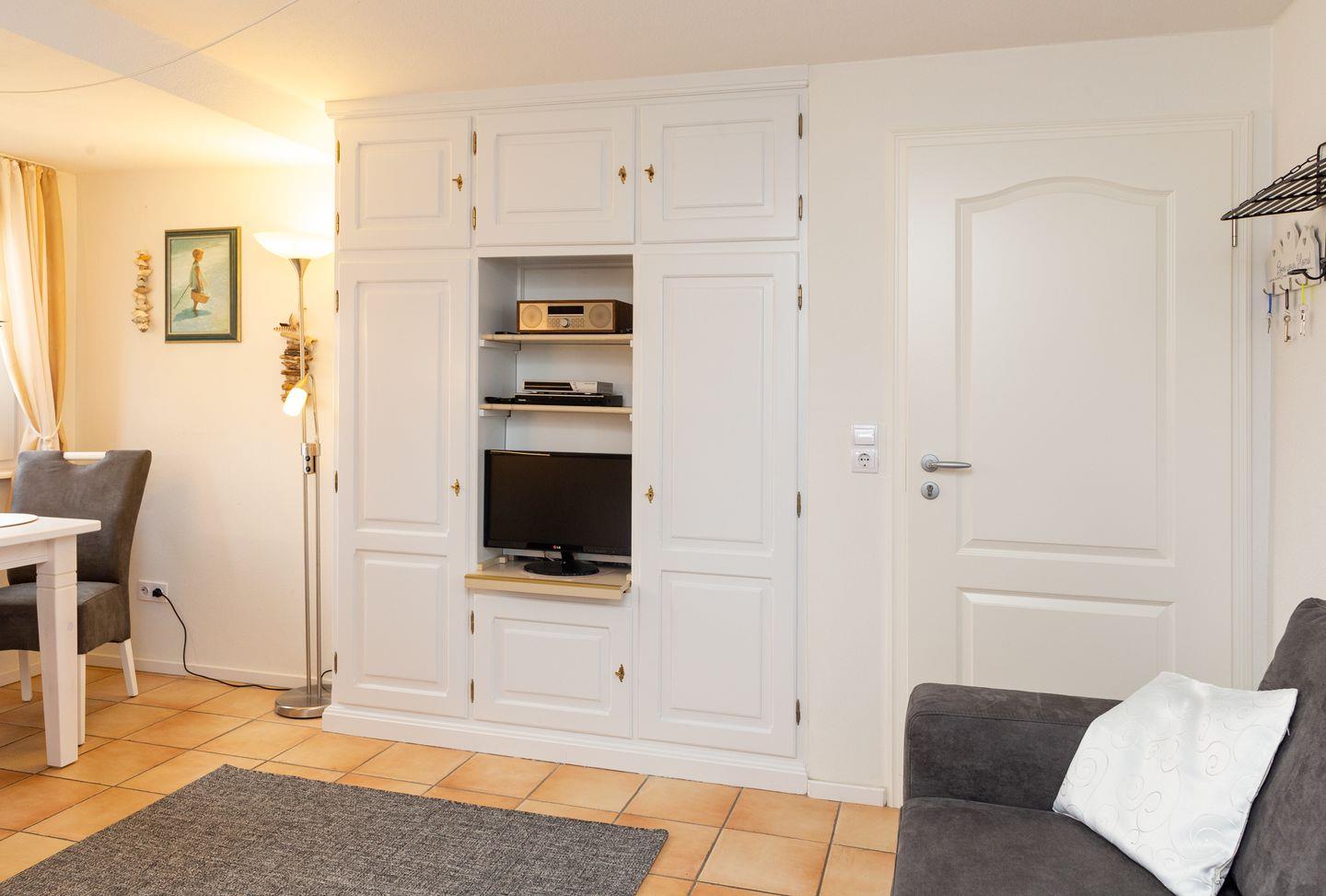 Im weiteren Teil des Wohnraumes befindet sich das Sofa, der Kleiderschrank, der Flachbild TV und ein gut gefülltes Bücherregal.