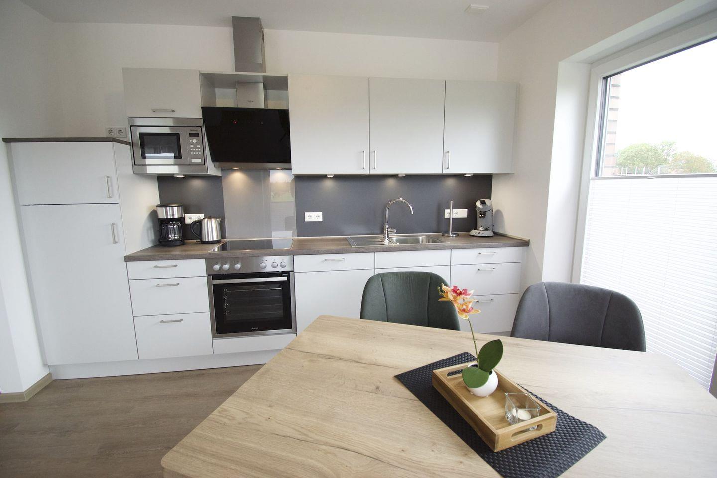 Unsere Ferienwohnung Möwennest im Haus Steuerbord ist eine exklusive, wunderschöne und hochwertige Ferienwohnung für max. 4 Personen in ruhiger und strandnaher Lage des Nordseeheilbades Norddeich. Die Einbauküche verfügt über folgende Ausstattung: Spülmaschine, Backofen, Ceranfeld, Mikrowelle, Kühlschrank mit doppeltem Gefrierfach. Vinyl- und Fliesenböden in allen Räumen. Barrierefrei/behindertengerecht.