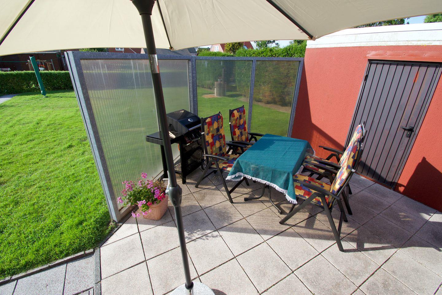 Ihre windgeschützte Terrasse mit hochwertigen Gartenmöbeln, Sonnenschirm und einem Gasgrill lädt Sie zu gemütlichen Grillabenden ein.