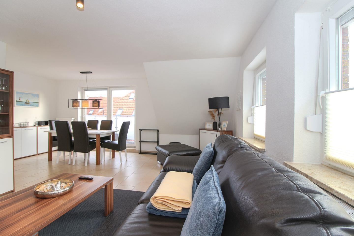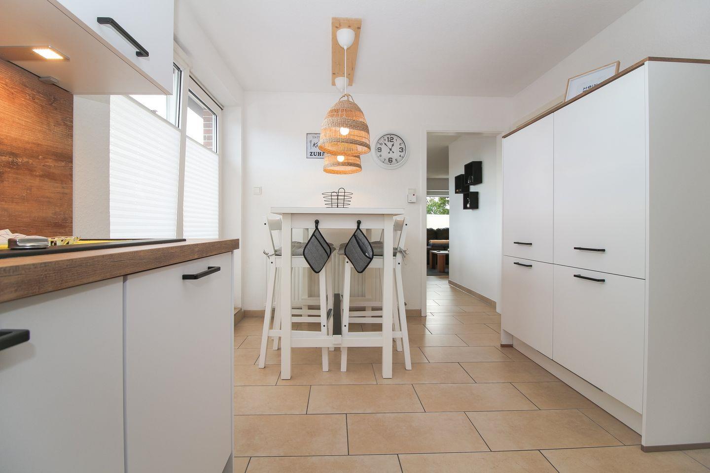 Über eine Außentreppe gelangen Sie zu unserem liebevoll eingerichteten Ferienapartment mit 2 Schlafzimmern. Die Ferienwohnung Riff V bietet einen äußerst großzügigen Und falls das Wetter doch noch zu einem Abendspaziergang lockt, ist der Deich nur wenige Meter entfernt.