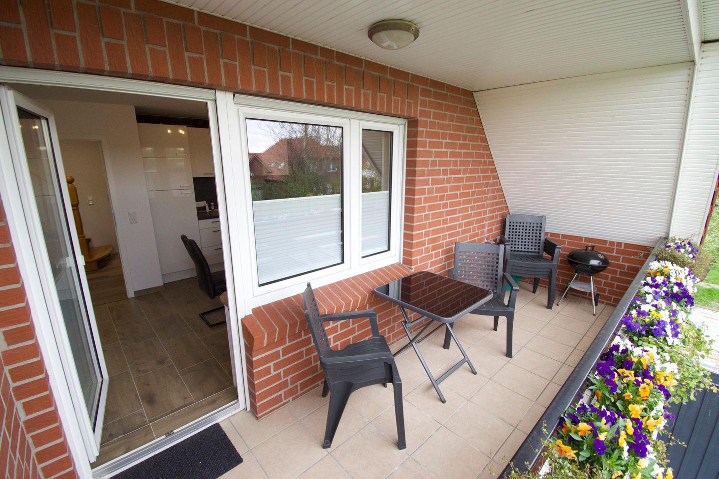 Komfortables 4-Sterne-Ferienhaus 'Sonnendeck' in Norddeich mit Balkon, WLAN und Gartenblick für erholsame Urlaubstage.
