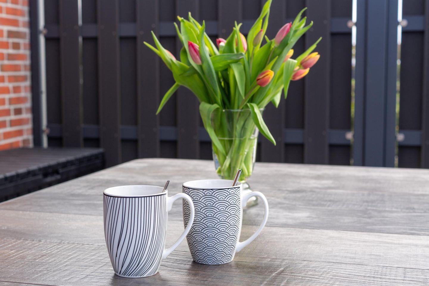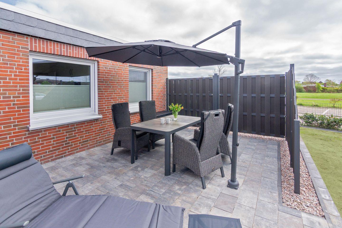 Auf der sonnigen Terrasse erwartet Sie eine stilvolle Sitzgruppe mit vier hochwertigen Hochlehner-Stühlen und einem großen Tisch – ideal für entspannte Stunden im Freien. Der geschmackvolle Sichtschutz sorgt nicht nur für Privatsphäre, sondern fügt sich auch optisch harmonisch in das Gesamtbild ein. Der großzügige Garten (vollständig eingezäunt) lädt zum Sonnenbaden, Spielen oder Entspannen ein und bietet auch Ihrem Vierbeiner ausreichend Auslauf.