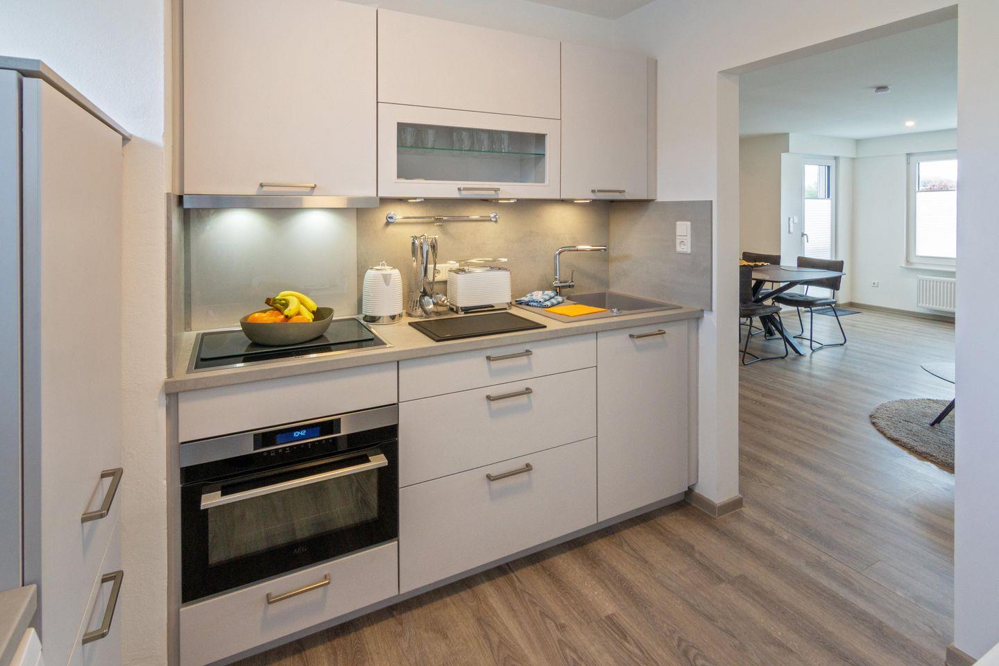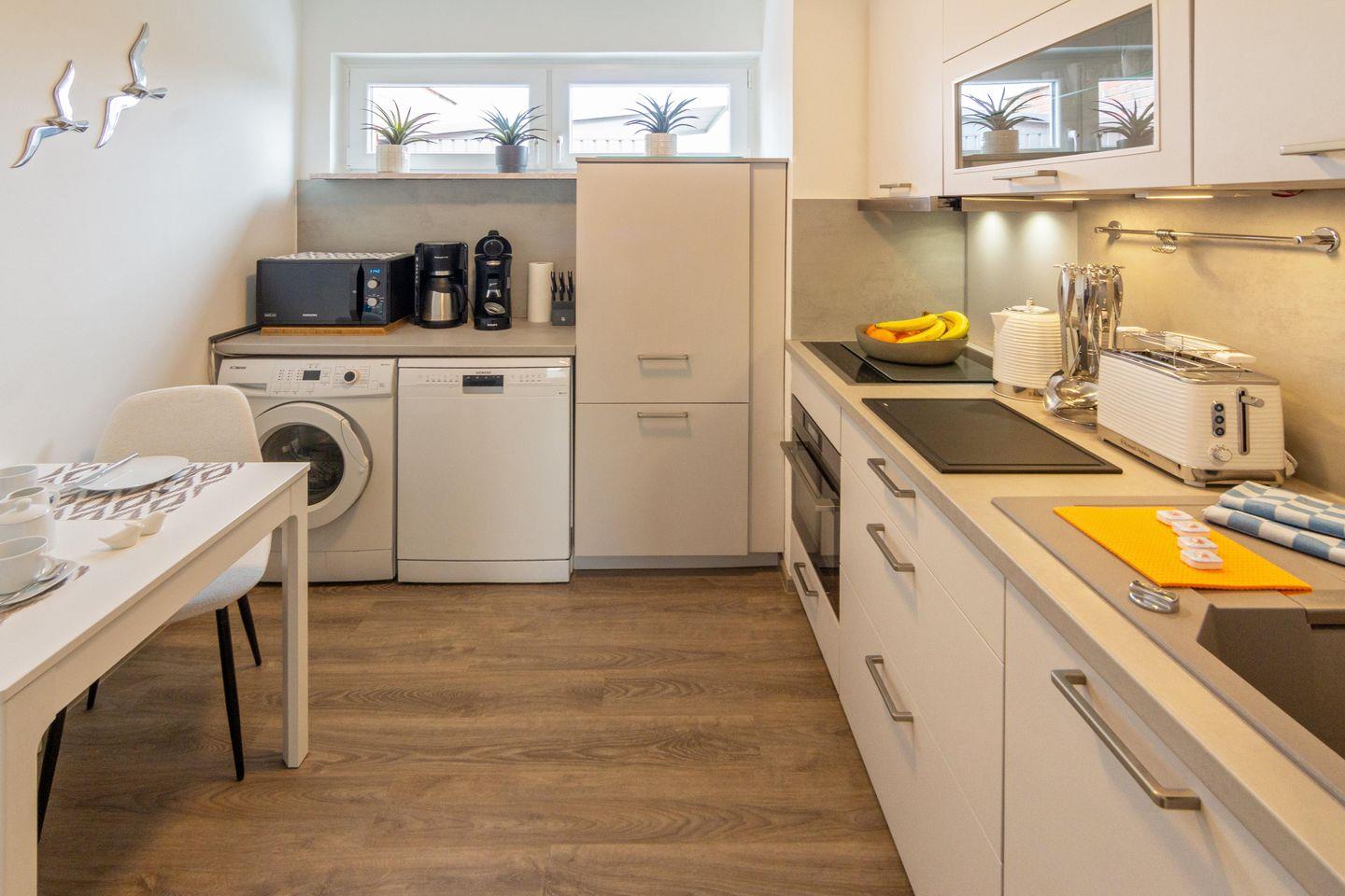 Die großzügige Eckküche ist bestens ausgestattet: Backofen, Mikrowelle, Cerankochfeld, Kühlschrank mit Gefrierfach (zwei Schubladen), Spülmaschine und sogar eine Waschmaschine stehen zur Verfügung.