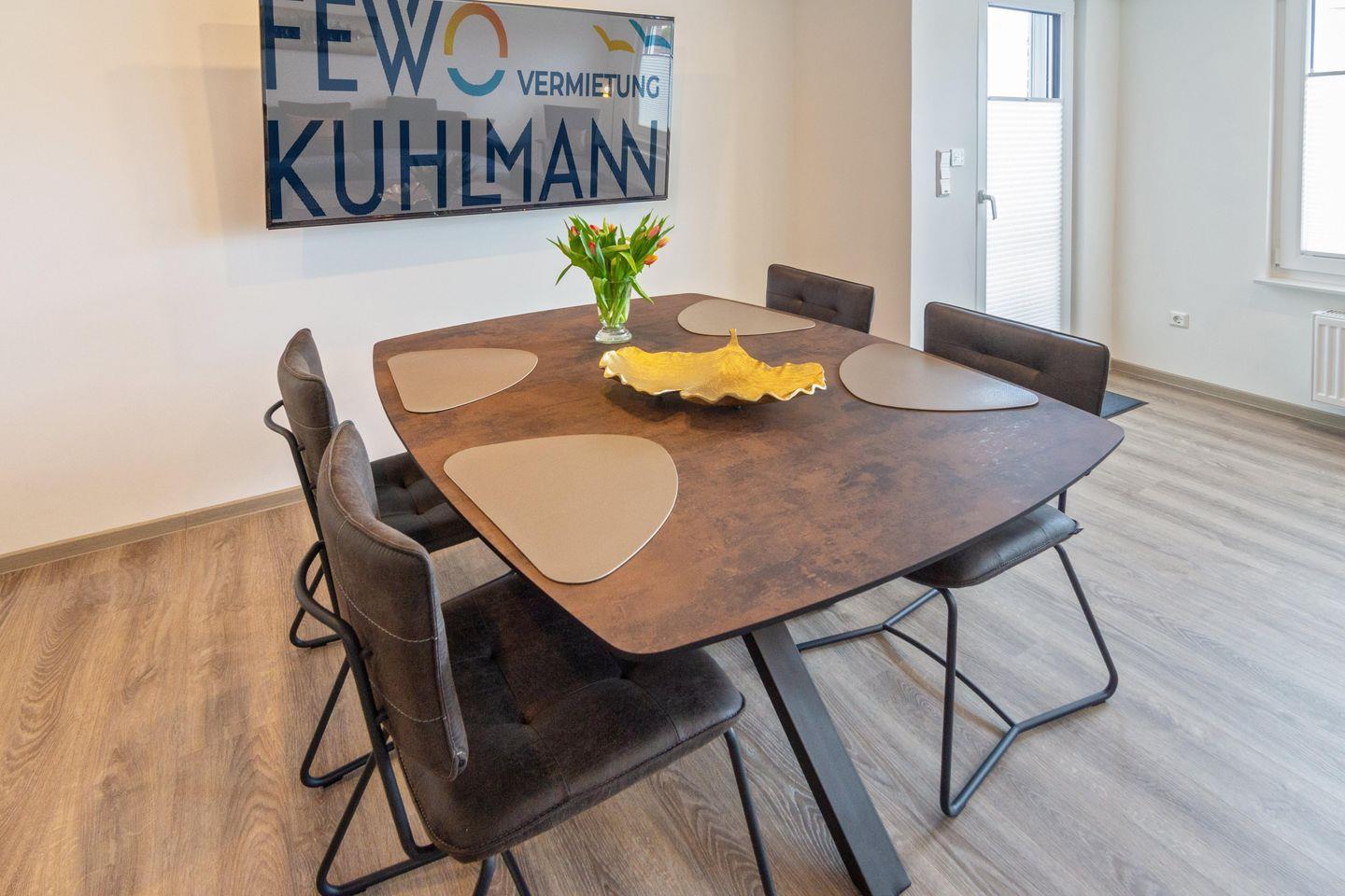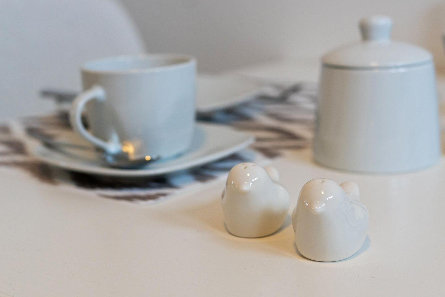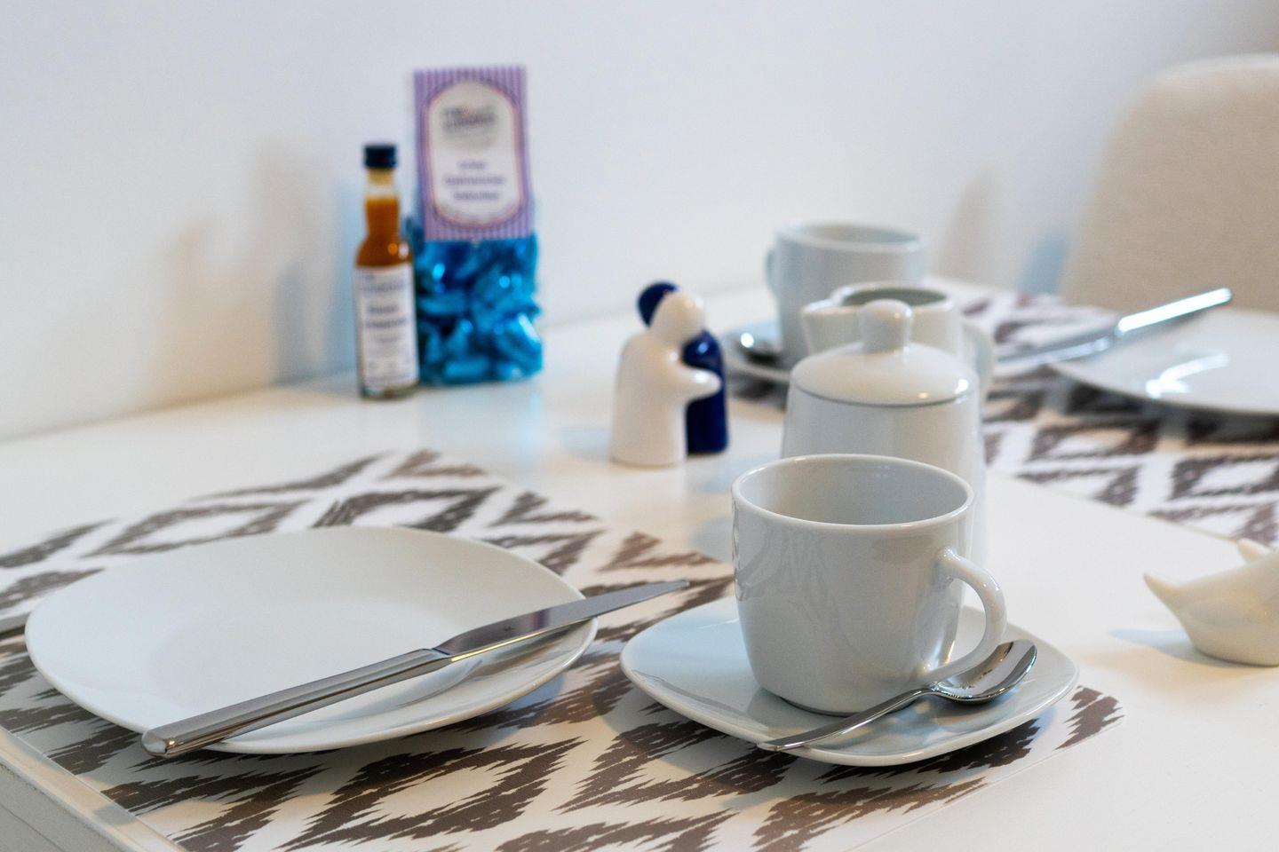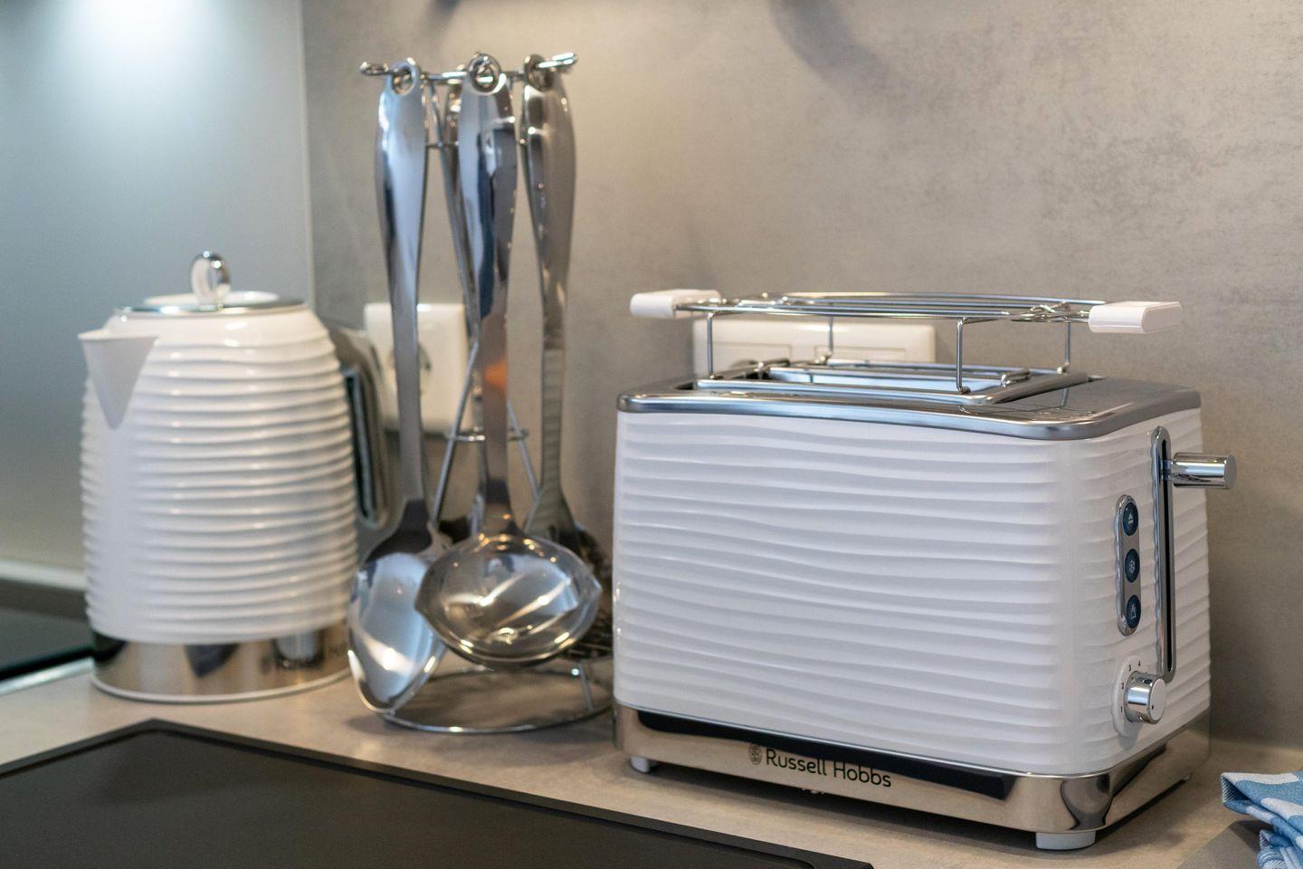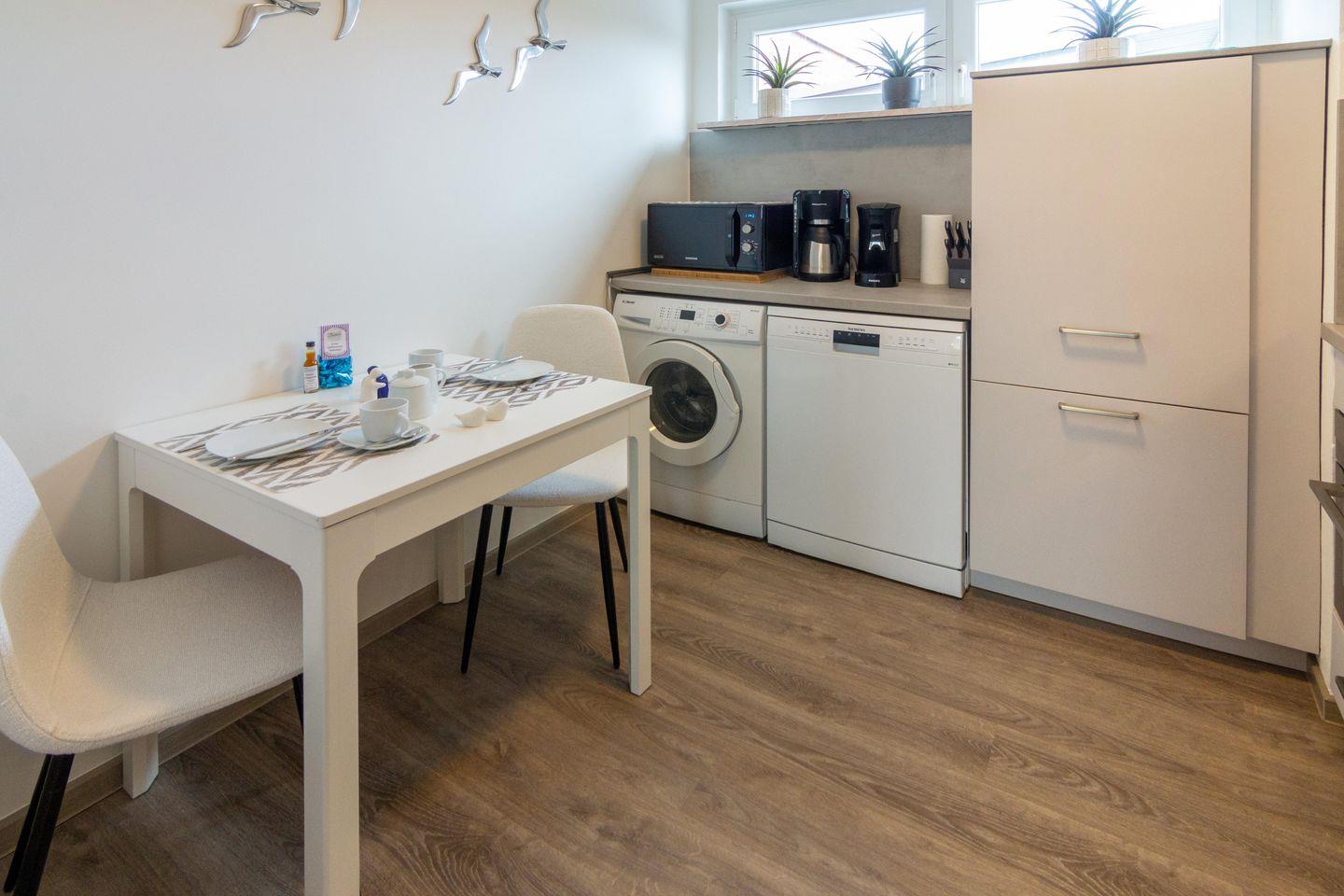 Für Kaffeeliebhaber gibt es sowohl eine Filterkaffeemaschine als auch eine Senseo-Padmaschine. Weitere Annehmlichkeiten: Mixer, Toaster, Eierkocher, Wasserkocher – und natürlich ein Original ostfriesisches Teeservice. Der Vinylboden in Holzoptik rundet den gemütlichen Küchenbereich ab.