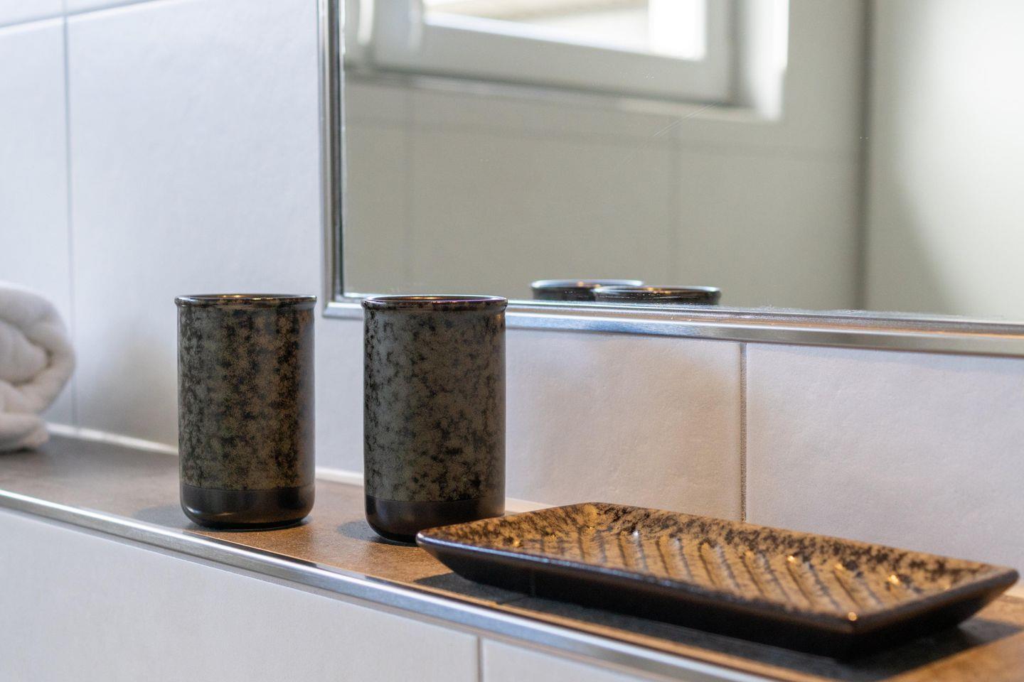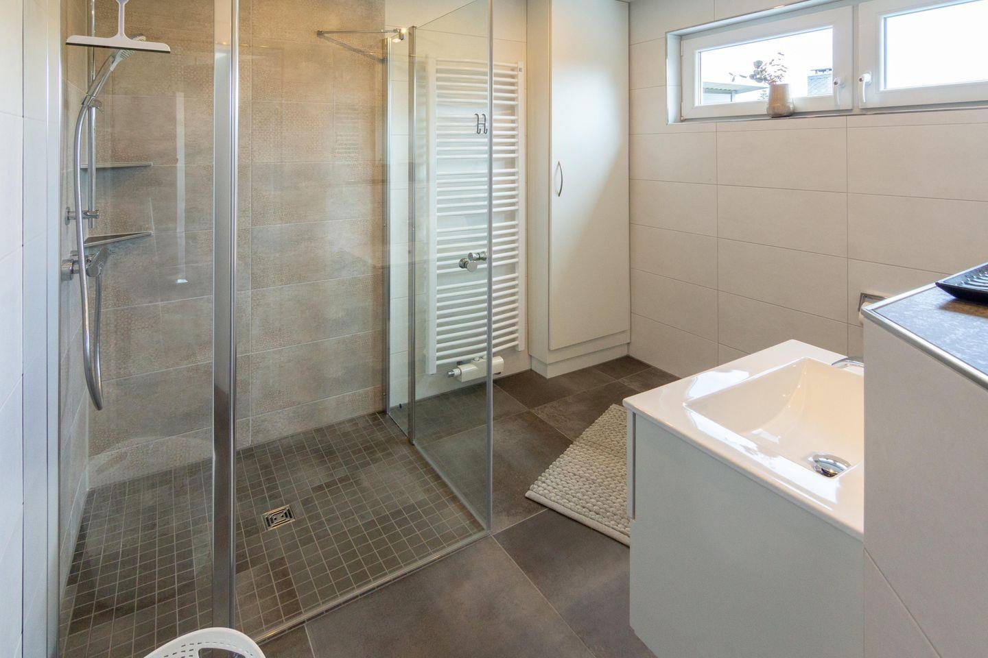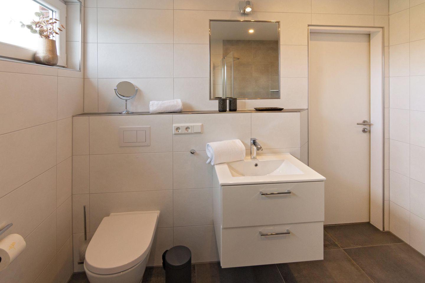 Zur Ausstattung gehören außerdem ein Hänge-WC, ein Waschbecken mit Unterschrank, eine großzügige bodengleiche Dusche (100 x 120 cm), ein großer Wandspiegel, Kosmetikspiegel sowie ein Kosmetikeimer – für den perfekten Start in den Tag.