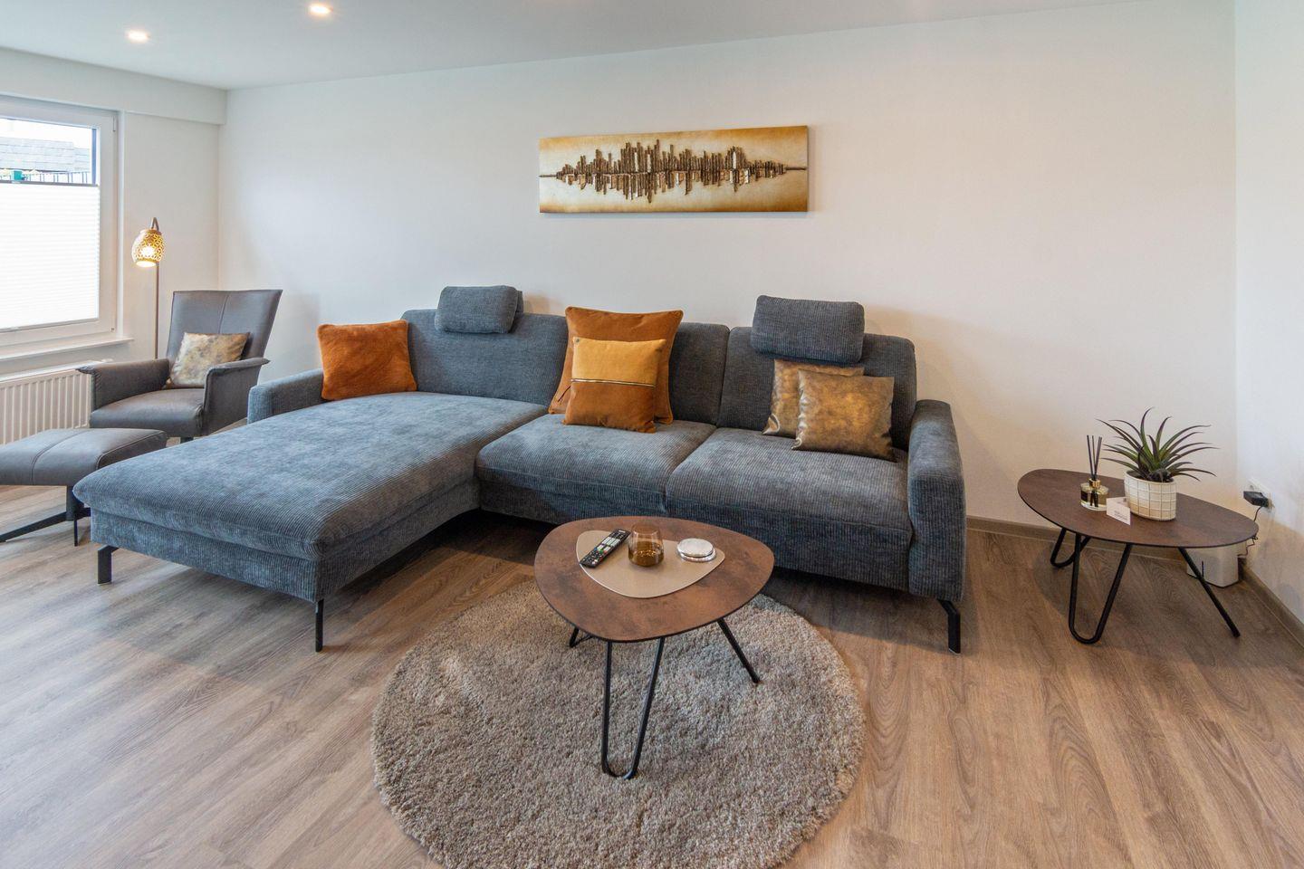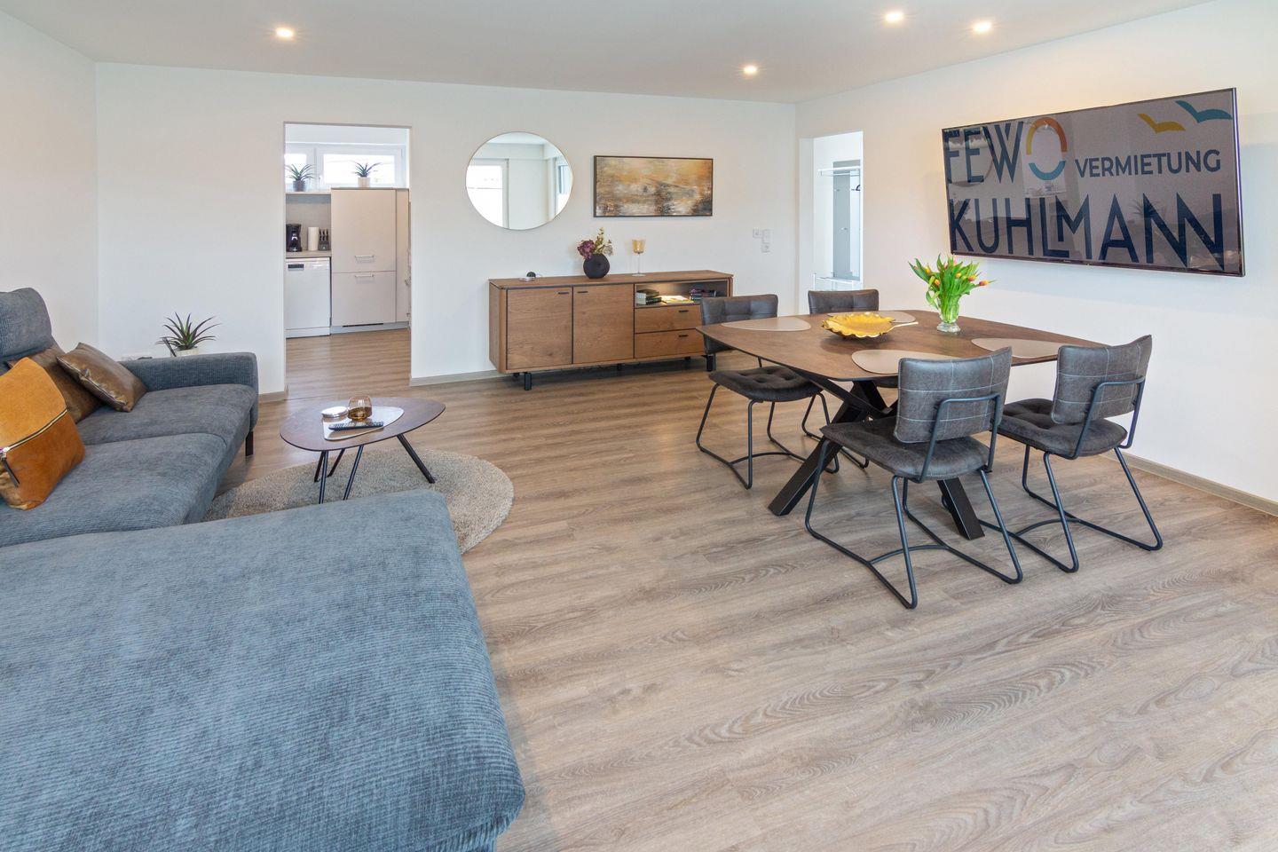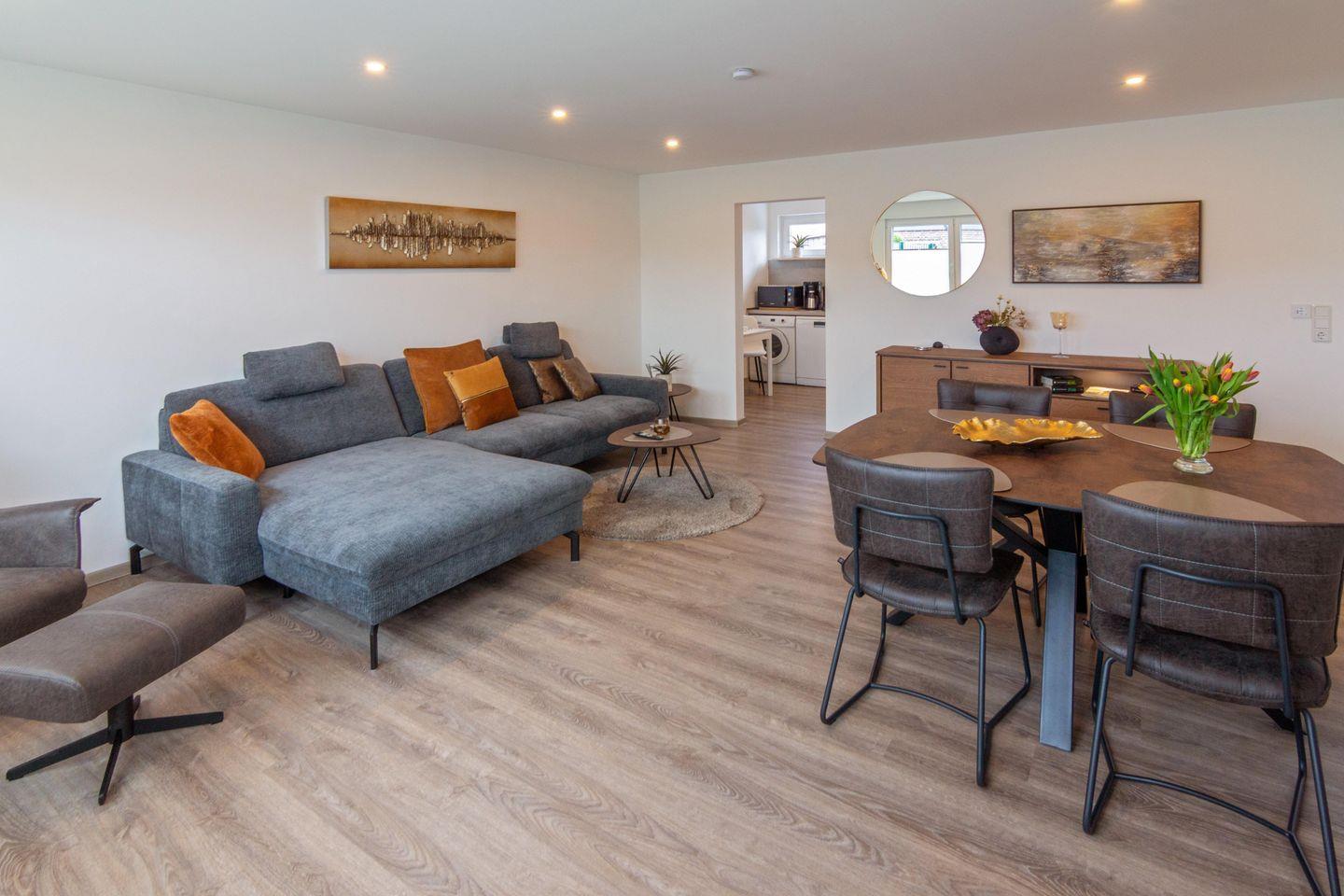 Das großzügige Komfort-Polstersofa in L-Form lädt zum gemütlichen Entspannen ein und wird ergänzt durch zwei Beistelltische in Betonoptik. Der angrenzende Essbereich umfasst einen stilvollen Esstisch mit vier bequemen Design-Stühlen von H&H.