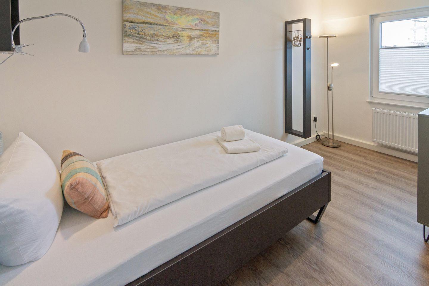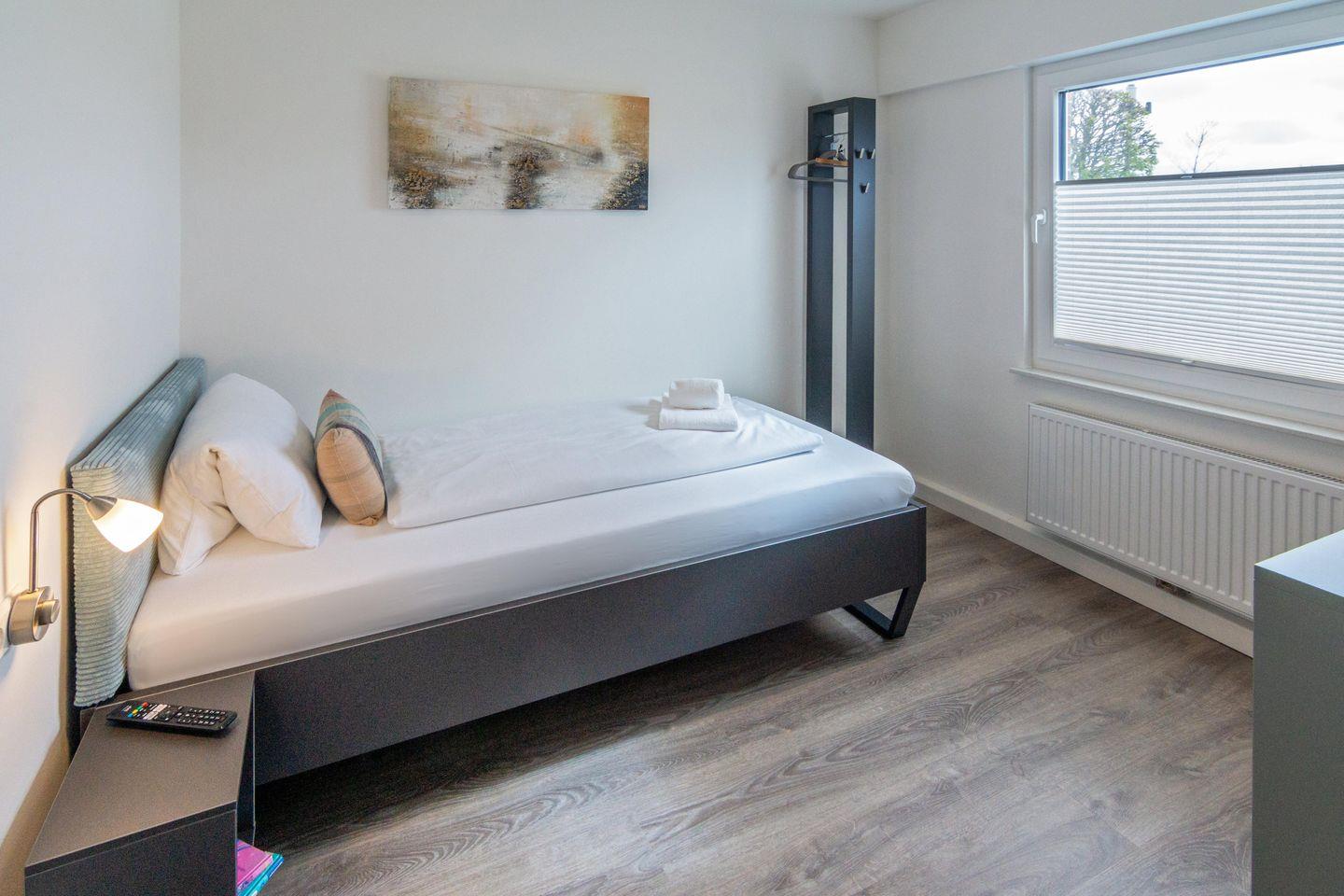 Dieses helle Zimmer verfügt über ein großes Fenster mit Fliegengitter, Plissee und Außenjalousie sowie einen Heizkörper. Das bequeme Bett (100 x 200 cm) ist mit einer hochwertigen DUNLOPILLO-Schaummatratze und einem verstellbaren Lattenrost (Kopf- und Fußteil) „Vrengen - Flex“ ausgestattet – für besten Schlafkomfort.