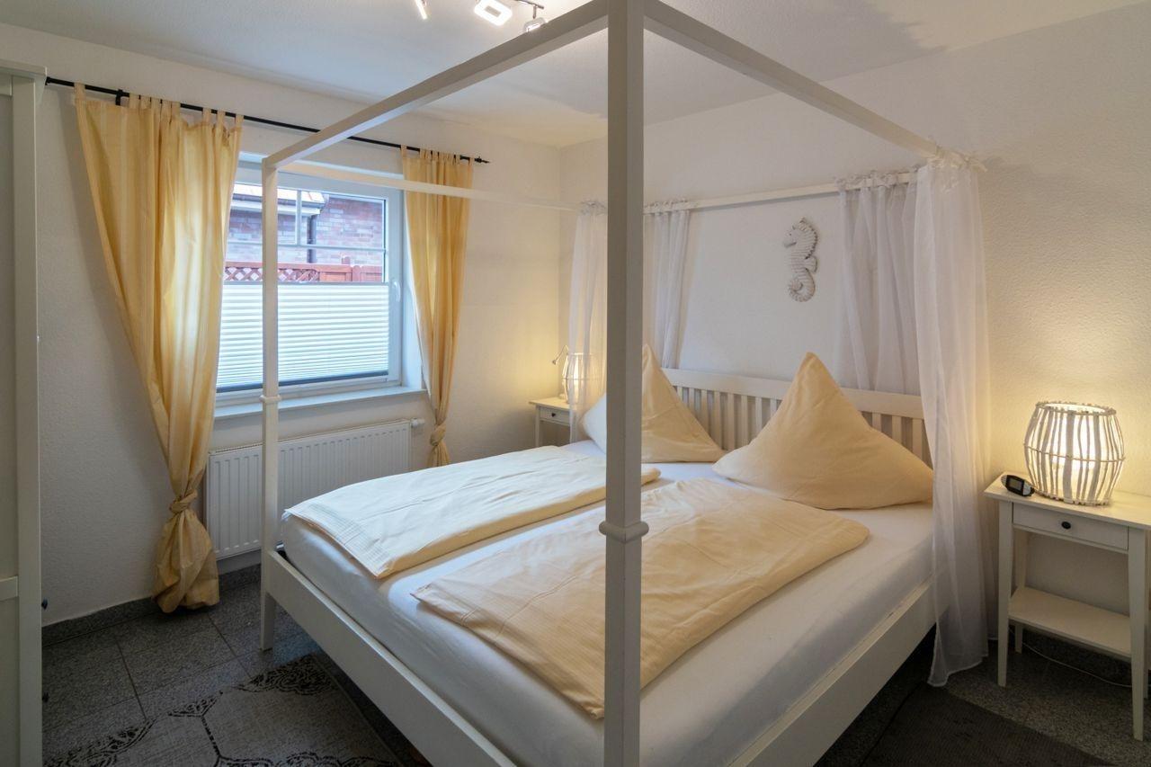 Das separate Schlafzimmer lädt mit seinem Himmelbett zum Träumen ein.