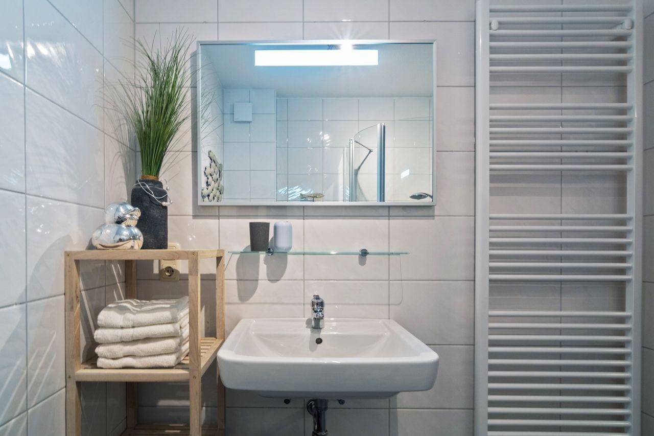Das schöne Badezimmer ist hell gefliest- Es handelt sich um ein Duschbad, dessen Dusche von einer Glaskabine umschlossen wird. Handtuchwärmer und Fußbodenheizung sorgen vor allem in den kälteren Monaten für besonders behaglichen Komfort. Waschbecken, Spiegel, WC und ausreichend Ablagemöglichkeiten ergänzen das Bad stimmig.