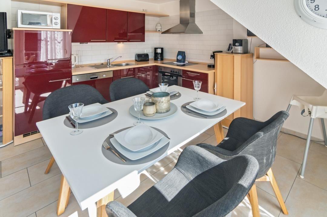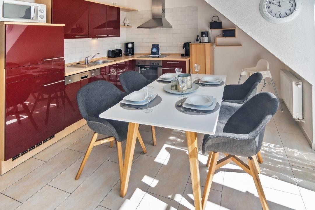 Die leuchtend rote Küchenzeile macht Spaß und lädt zum Kochen ein. Hier steht Ihnen alles zur Verfügung, was zur Zubereitung gemeinsamer Mahlzeiten nötig ist.