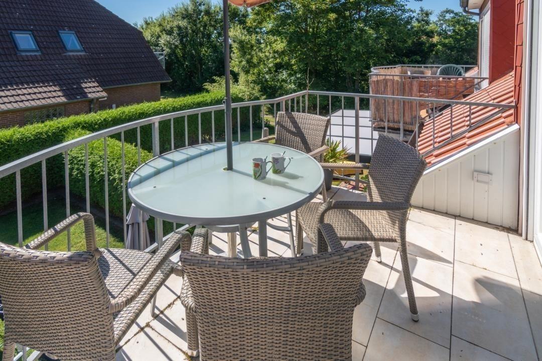Direkt vom Wohnraum gelangen Sie auf den schönen Balkon der Wohnung. Dank der Ausrichtung nach Südosten können Sie hier bereits am Morgen die ersten Sonnenstrahlen bei einem Frühstück an der frischen Luft genießen. Selbstverständlich wurde der Freisitz mit Tisch und Stühlen ansprechend möbliert, so dass Sie hier komfortabel verweilen können. Genießen Sie die frische Luft und den Ausblick auf den Frisia-Teich.