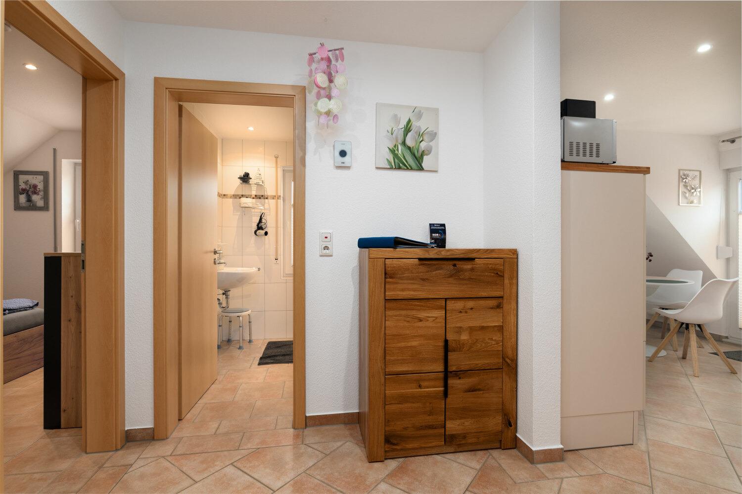 Die Wohnung ist hochwertig eingerichtet und verfügt über ein gemütliches Schlafzimmer mit Ehebett, ein modernes Badezimmer mit ebenerdiger Dusche und ein Wohnzimmer mit Balkon – perfekt für gemütliche Abende zu zweit.