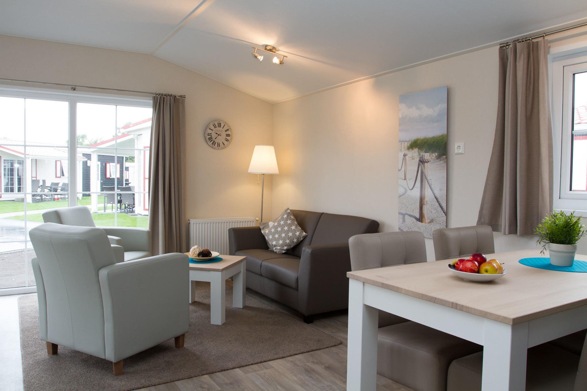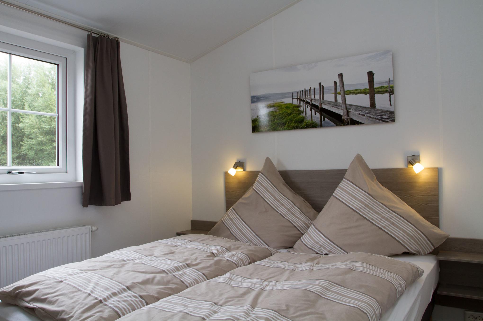 Ferienhaus mit rd. 45m² und Platz für bis zu vier Personen. 2 Schlafzimmer davon 1 mal mit Doppelbett und TV und 1 mal mit zwei Einzelbetten, 1 Badezimmer. Großer Wohnraum mit Küche, Sitzgelegenheiten und Unterhaltungsmedien (TV). Im Außenbereich gibt es einen Stellplatz für Ihr Auto und die Terrasse lädt zum gemütlichen Verweilen ein. Die Chalets befinden sich in einem eigenen Parkareal unseres Platzes mit eigener Zufahrt.