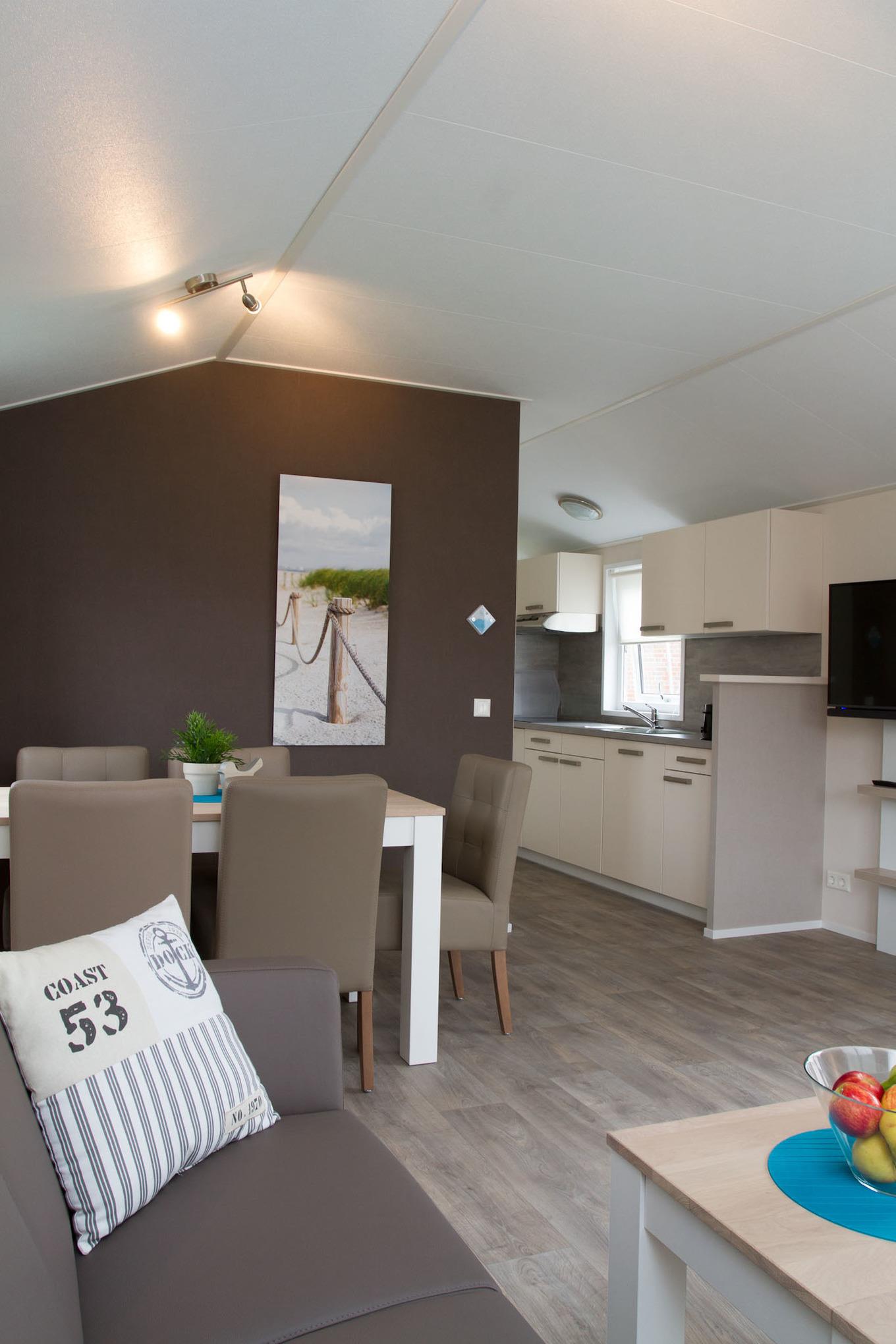 Barrierefreies Ferienhaus mit rd. 45m² groß und Platz für bis zu zwei Erwachsene und drei Kinder. 2 Schlafzimmer (eines mit Doppelbett und TV, eines mit Crossbett), 1 Badezimmer. Das Waschbecken ist höhenverstellbar und die Dusche befahrbar Großer Wohnraum mit Küche, Sitzgelegenheiten und Unterhaltungsmedien (TV). Im Außenbereich gibt es einen Stellplatz für Ihr Auto und die Terrasse lädt zum gemütlichen Verweilen ein. Das Restaurant im Nordsee-Cmap Norddeich ist von Mitte April bis Mitte Oktober geöffnet.