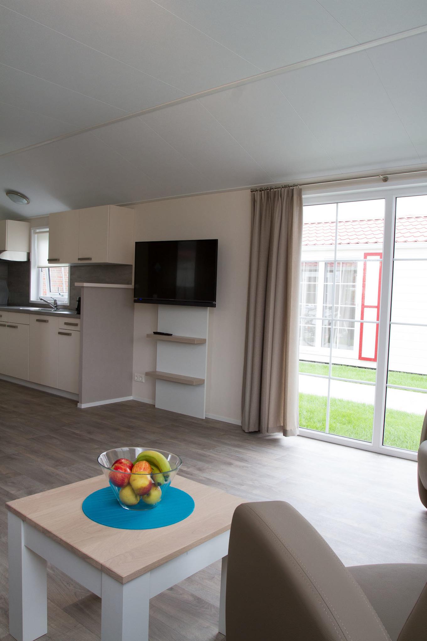 Ferienhaus mit rd. 45m² groß und Platz für bis zu zwei Erwachsene und drei Kindern.. 2 Schlafzimmer (eines mit Doppelbett und TV, eines mit Crossbett), 1 Badezimmer. Großer Wohnraum mit Küche, Sitzgelegenheiten und Unterhaltungsmedien (TV). Im Außenbereich gibt es einen Stellplatz für Ihr Auto und die Terrasse lädt zum gemütlichen Verweilen ein. Die Chalets befinden sich in einem eigenen Parkareal unseres Platzes mit eigener Zufahrt.
