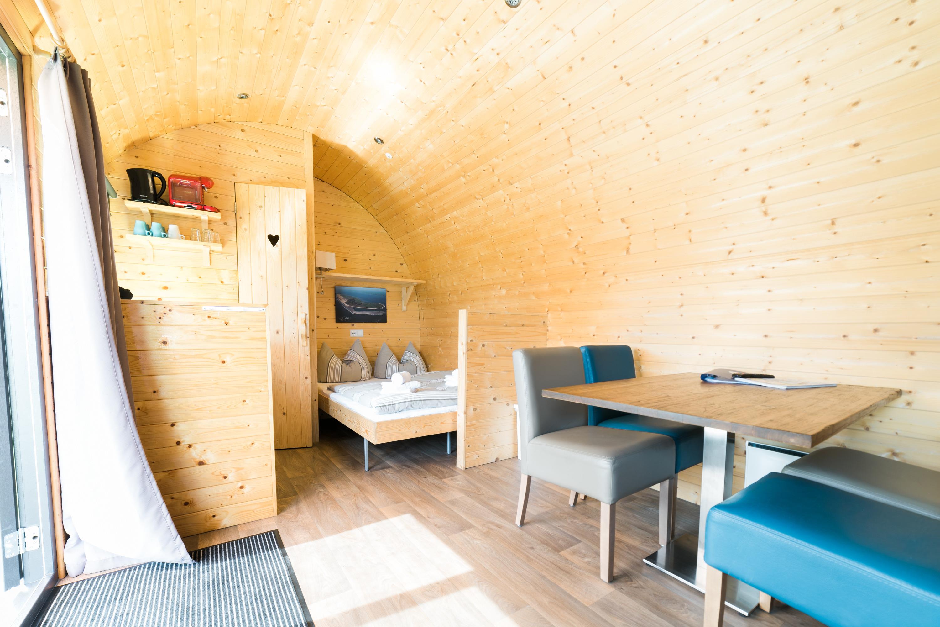 Klein und fein ist die Devise dieser kompakten Holzhäuser für den Urlaub. Das heißt in keinem Fall, dass man auf Komfort verzichten muss. In den Nordsee-Wellen findet man alles was den Urlaub angenehm gestalten lässt. Eine Toilette, ein kleines Waschbecken, Sitzgelegenheiten, zwei kleine Kochplatten, einen Fernseher, eine Kaffeekapselmaschine und eine Elektroheizung. Weitere sanitäre Einrichtungen wie z. B. Duschen etc., finden Sie in kurzer Entfernung in unserem Sanitärgebäude. Die großen Nordseewellen bieten Platz für zwei oder bis zu vier (zwei Erwachsene, zwei Kinder) Personen. Diese Art der Unterkunft ist ideal für Aktivurlauber oder all jene, die den direkten Kontakt zur Natur suchen.