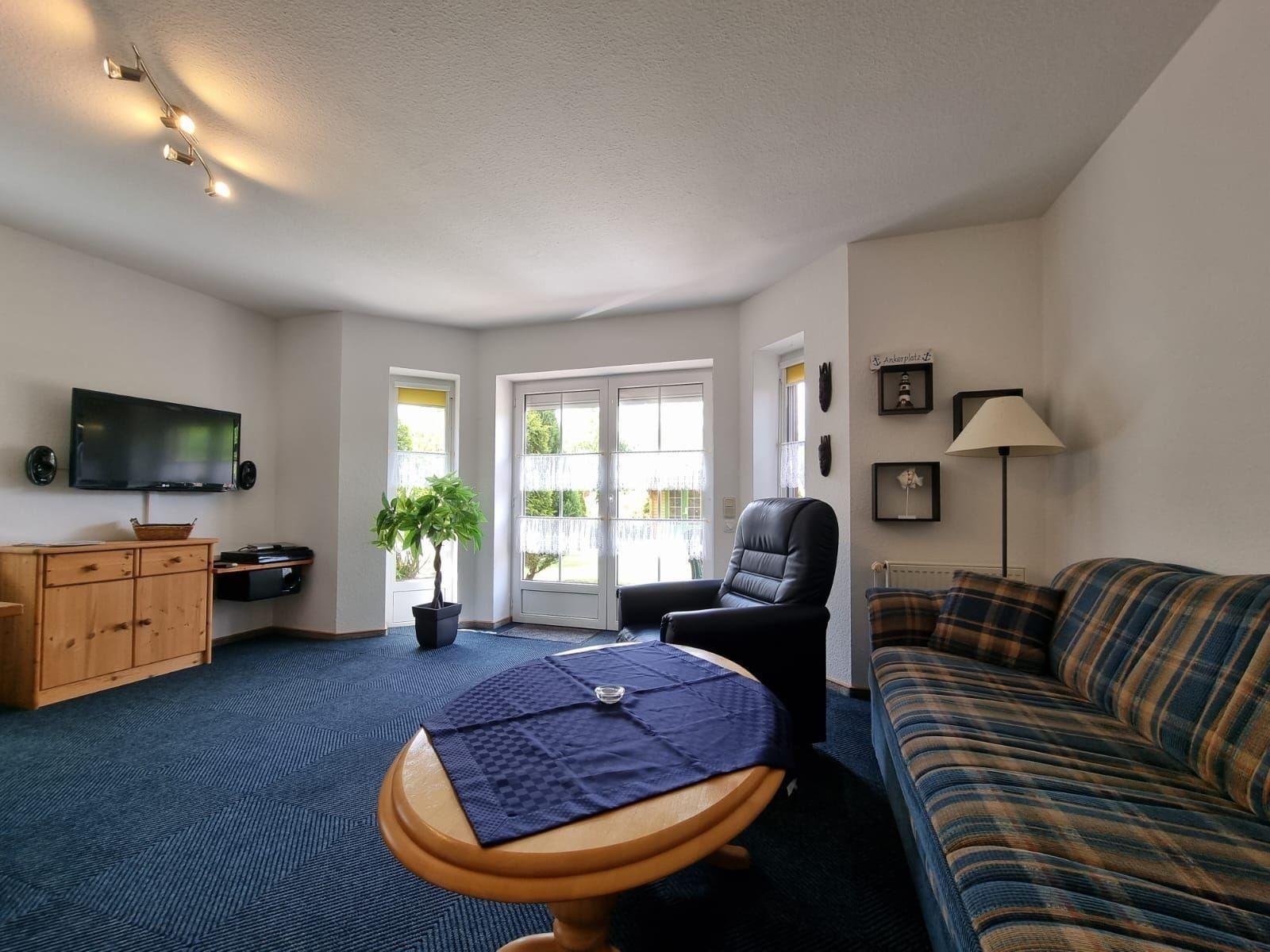 Die Ferienwohnung bietet eine durchdachte Raumaufteilung und umfassende Ausstattung für einen erholsamen Aufenthalt. Im großzügigen Wohnzimmer laden eine große Couch und ein moderner Fernsehsessel zum Entspannen ein. Der Flat-TV mit Satellitenanlage sowie ein Blu-Ray-Player und eine HiFi-Anlage sorgen für Unterhaltung. Die komplett ausgestattete Küche verfügt über einen Herd, Backofen, Geschirrspüler und Kühl-Gefrierkombination sowie eine kleine Essecke.
