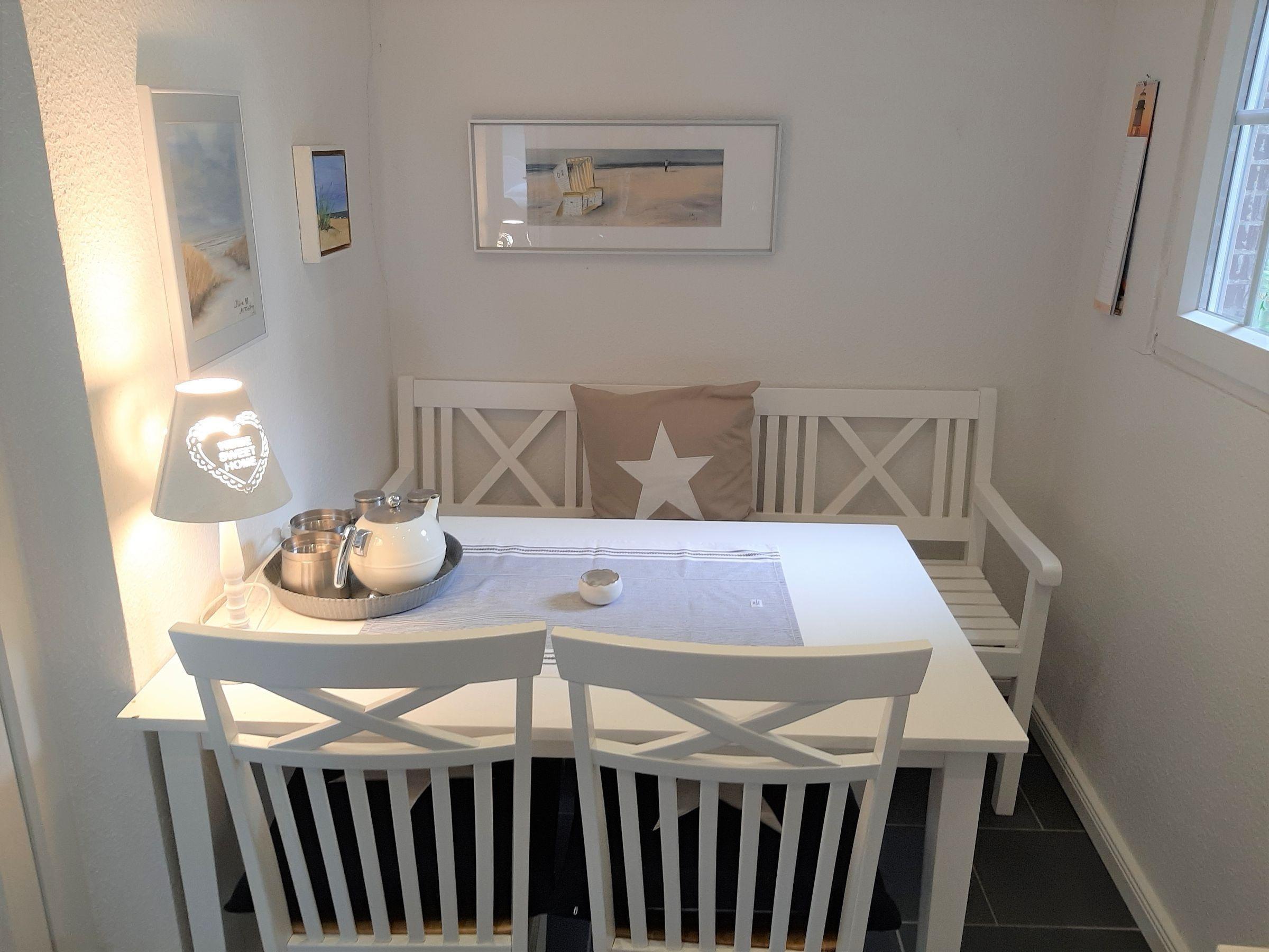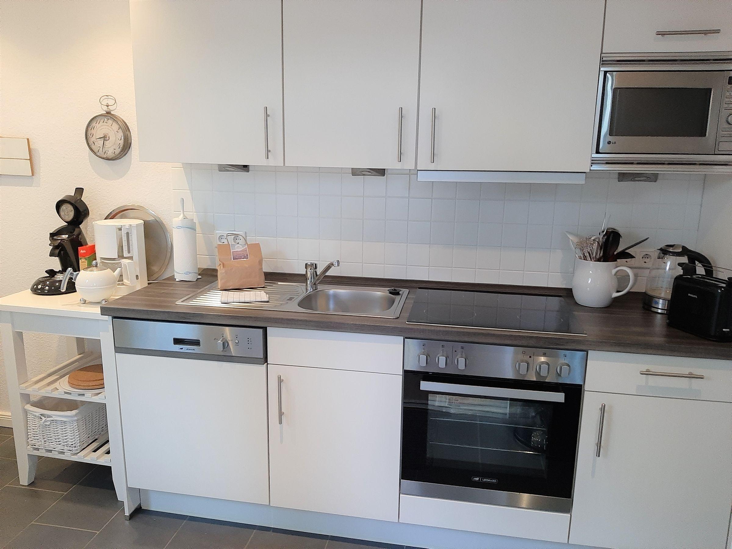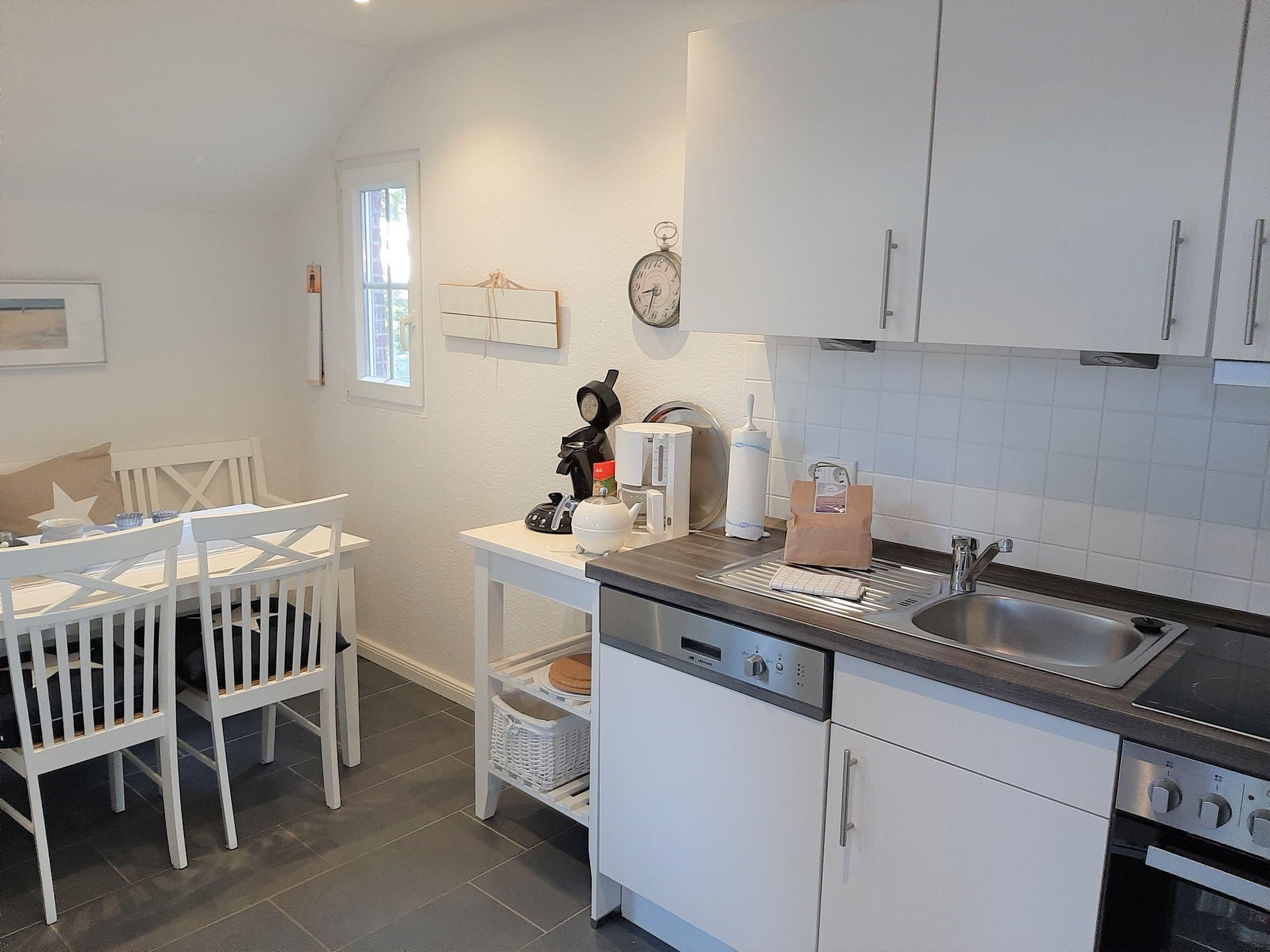 Die Ferienwohnung bietet eine moderne und allergikerfreundliche Ausstattung, die den Aufenthalt zum Vergnügen macht. Sie verfügt über zwei geräumige Schlafzimmer mit jeweils einem Doppelbett, ideal für Paare oder Familien. Die offene Küche ist voll ausgestattet und lässt keine Wünsche offen: Ein Geschirrspüler, Elektro- und Gasherd, Backofen, Mikrowelle, Kühlschrank, Kaffeemaschine, Toaster und Wasserkocher stehen zur Verfügung. Der einladende Esstisch lädt zu gemeinsamen Mahlzeiten ein.