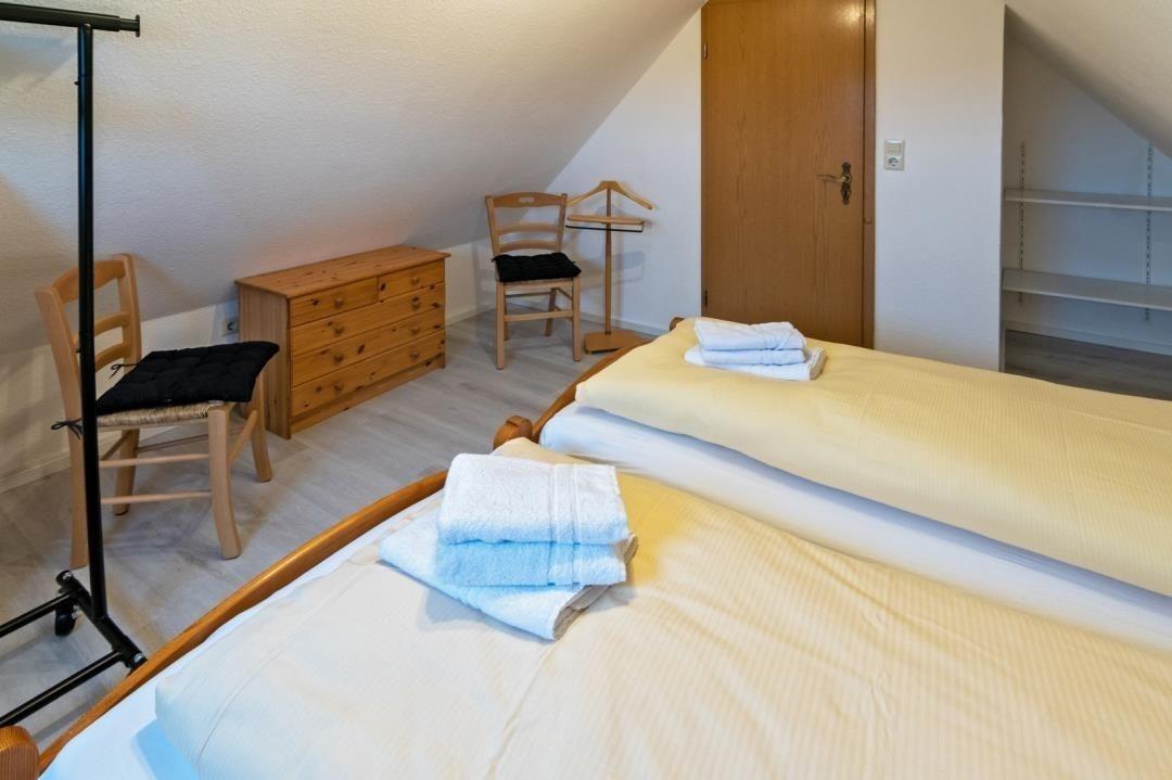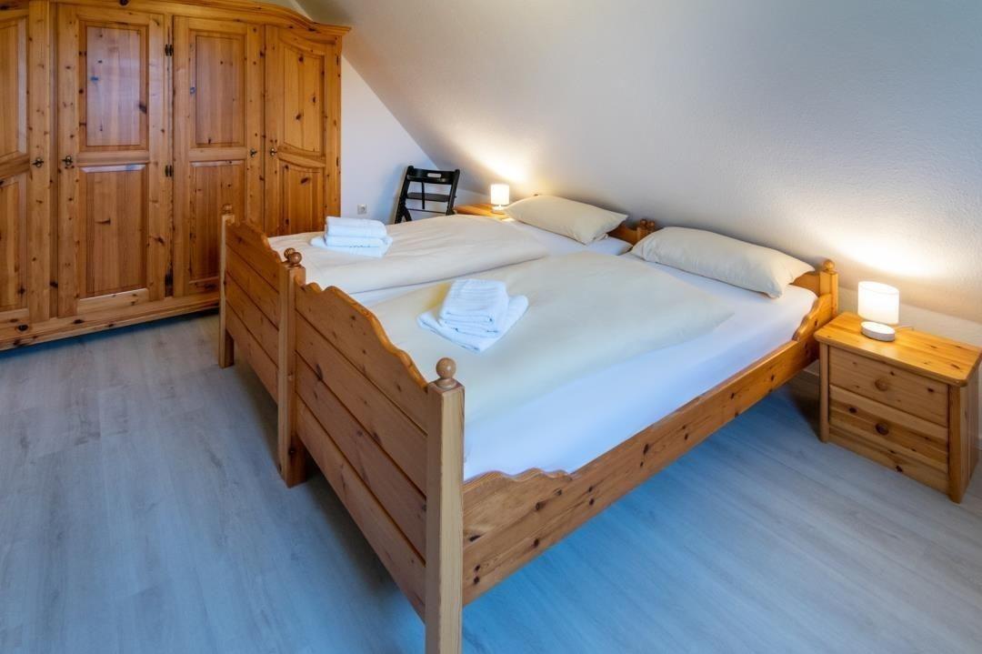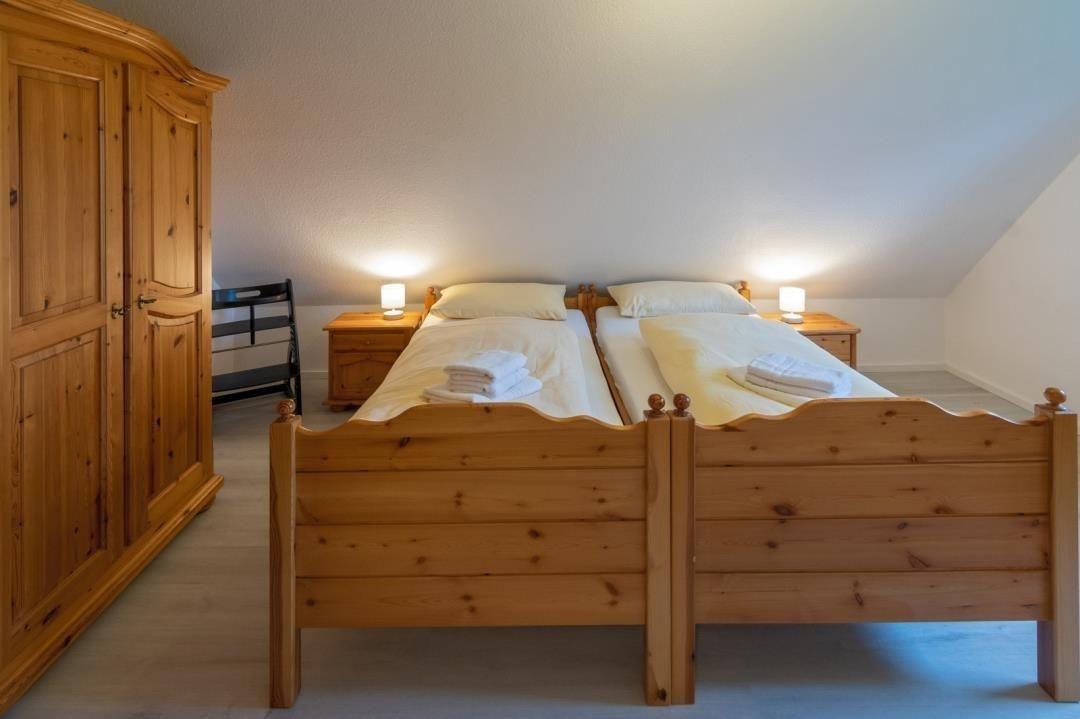 Das dritte Schlafzimmer befindet sich im zweiten Obergeschoss. Hier verfügen Sie über ein 180 x 200 cm großes Doppelbett, eine offene Konstruktion aus Kleiderstange und Regal sowie einen Herrendiener. Zudem wurde dieser Raum mit zwei Stühlen ausgestattet.