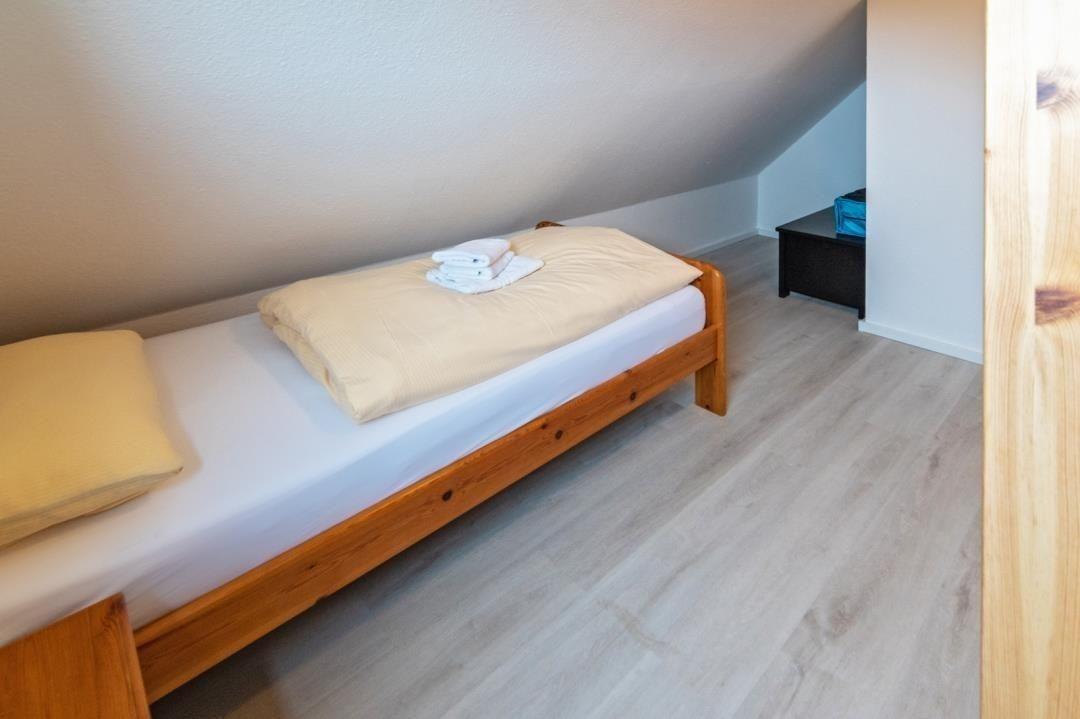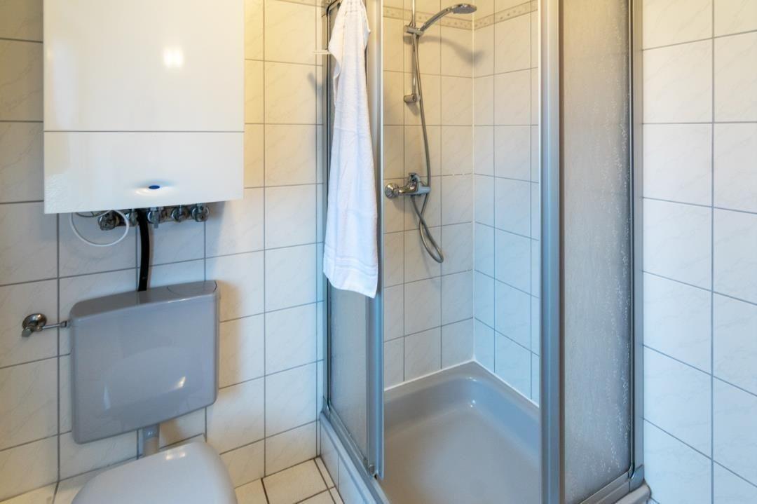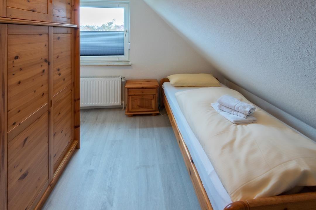 Das zweite Schlafzimmer auf gleicher Etage ist mit einem 90 x 200 cm großen Einzelbett und einem passenden Kleiderschrank ausgestattet. Darüber hinaus befindet sich im Obergeschoss ein Tageslichtbad mit Dusche, WC und Spiegel. Außerdem verfügt das Badezimmer über eine Waschmaschine, die Sie für die Dauer Ihres Aufenthaltes nutzen dürfen. Ein Bügelbrett und ein Bügeleisen sind ebenfalls vorhanden.