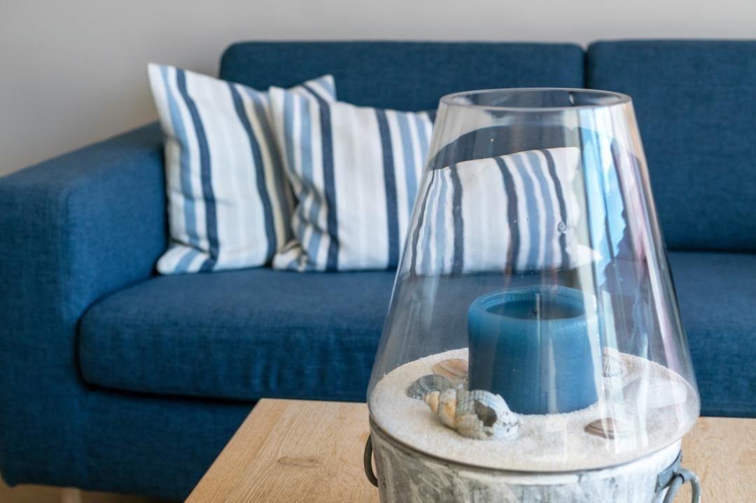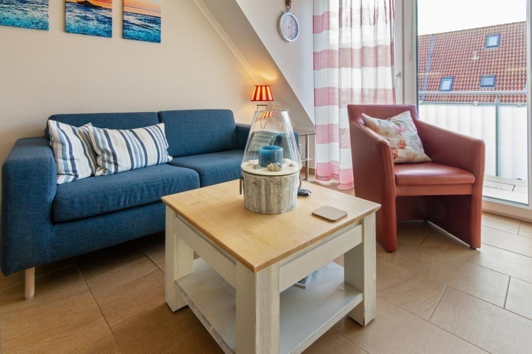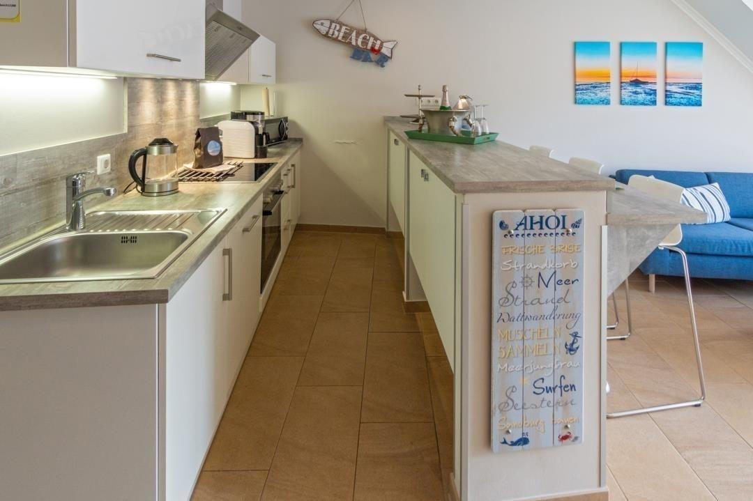 Das Herzstück dieser Wohnung mit ihrem maritimen Flair ist der offene Wohn-/Essbereich. Hier erwartet Sie eine moderne, voll ausgestattete Küchenzeile mit Cerankochfeld, Backofen, Geschirrspüler, Kühlschrank/Gefrierfach, Mikrowelle, Kaffee-/Espressomaschine, Wasserkocher und Toaster. Ein langer Tresen mit Hochstühlen grenzt den Kochbereich ab und lädt dazu ein, die zubereiteten Köstlichkeiten ganz leger zu genießen. Dahinter schließt sich ein gemütlicher Wohnbereich mit eleganter Ledergarnitur, Fernseher und HiFi-Soundsystem an. Zur Begrüßung stehen Sekt und Espressokapseln gratis zur Verfügung!