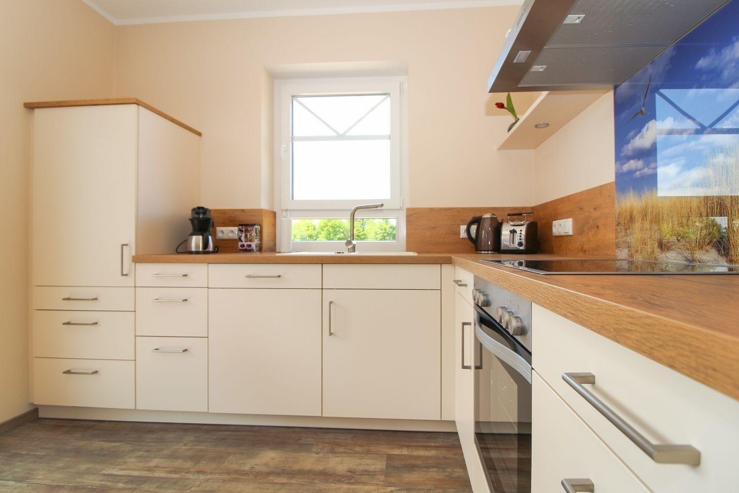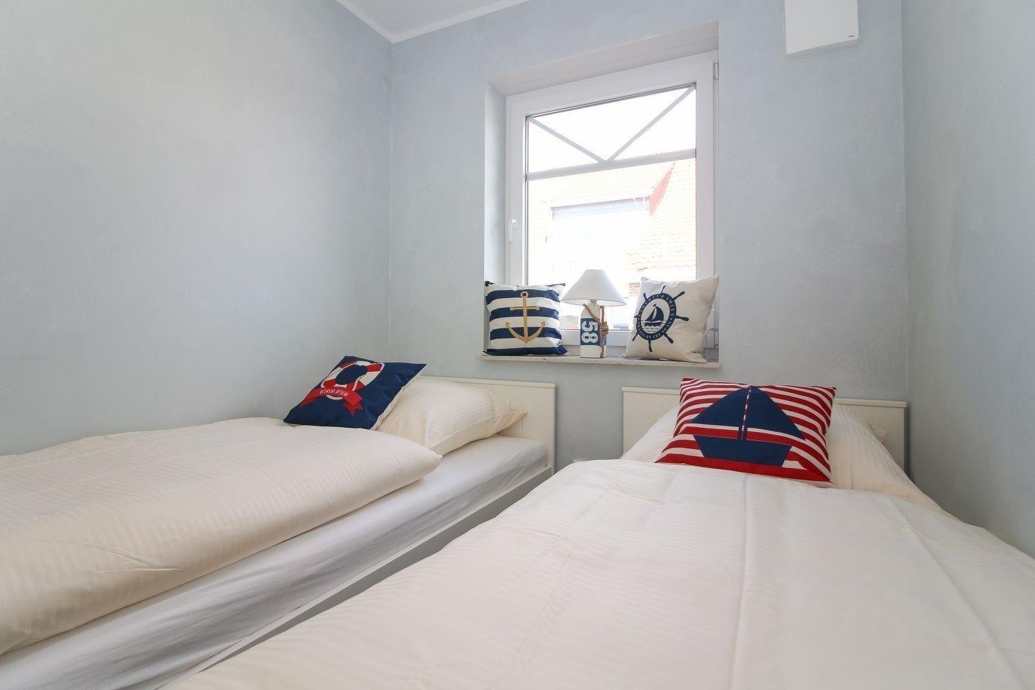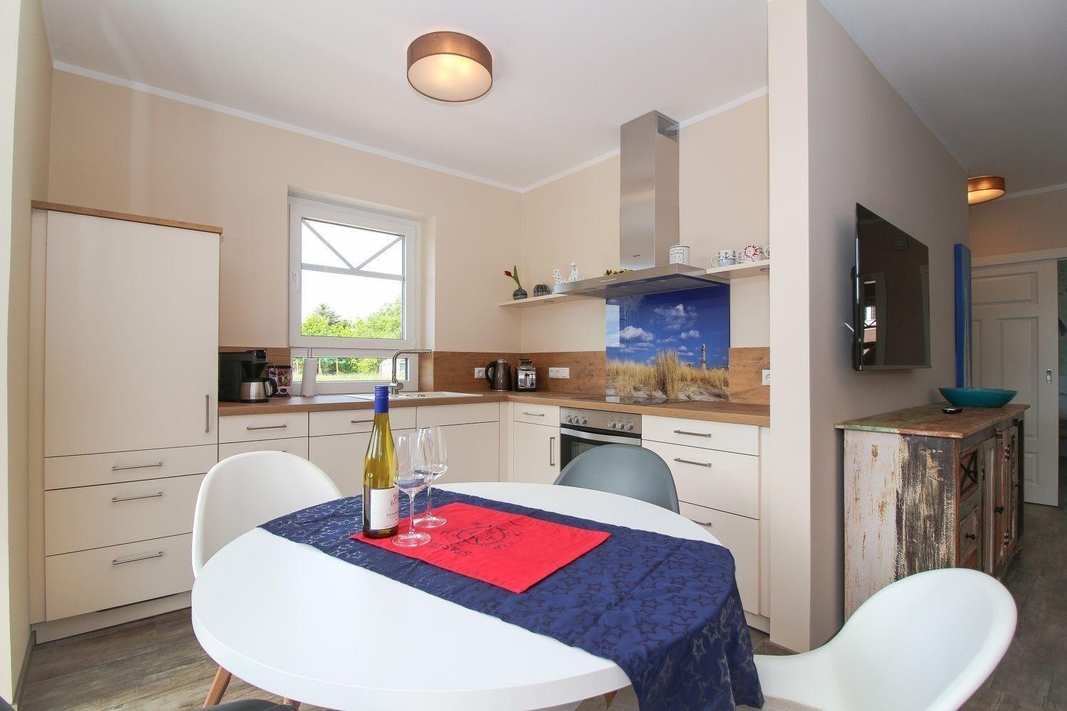 Die ca. 59 m² große Erdgeschosswohnung bietet Ihnen zwei Schlafräume mit Doppel- und Einzelbetten. Der offene Wohnbereich teilt sich seinen Platz mit einer voll ausgestatteten Einbauküche samt Essbereich mit Stühlen.