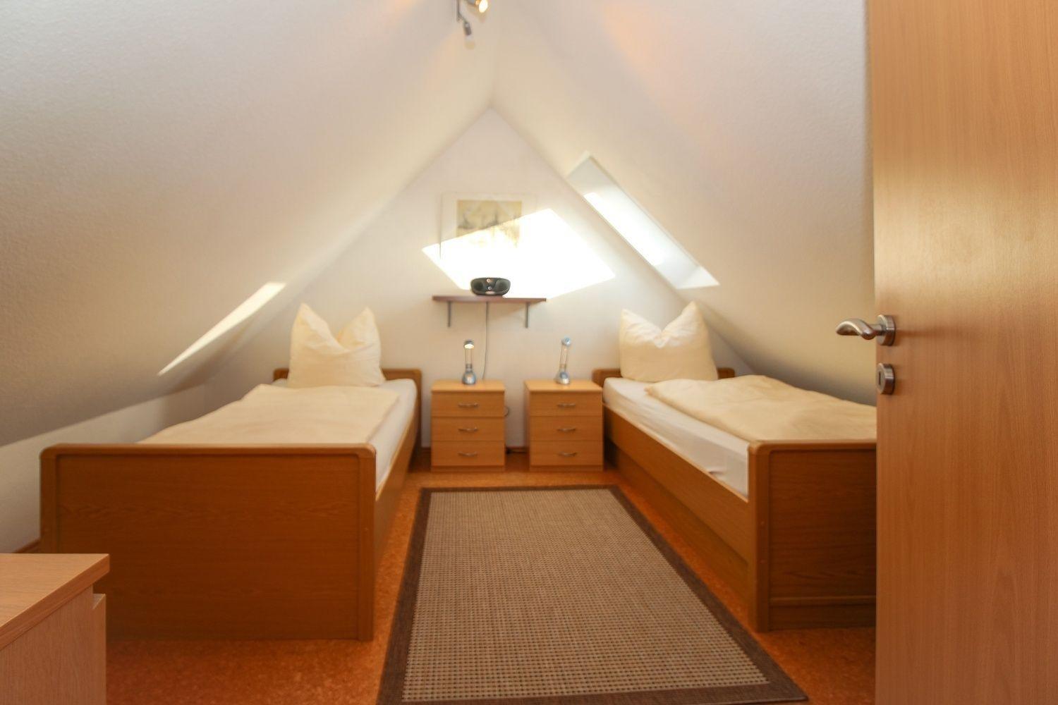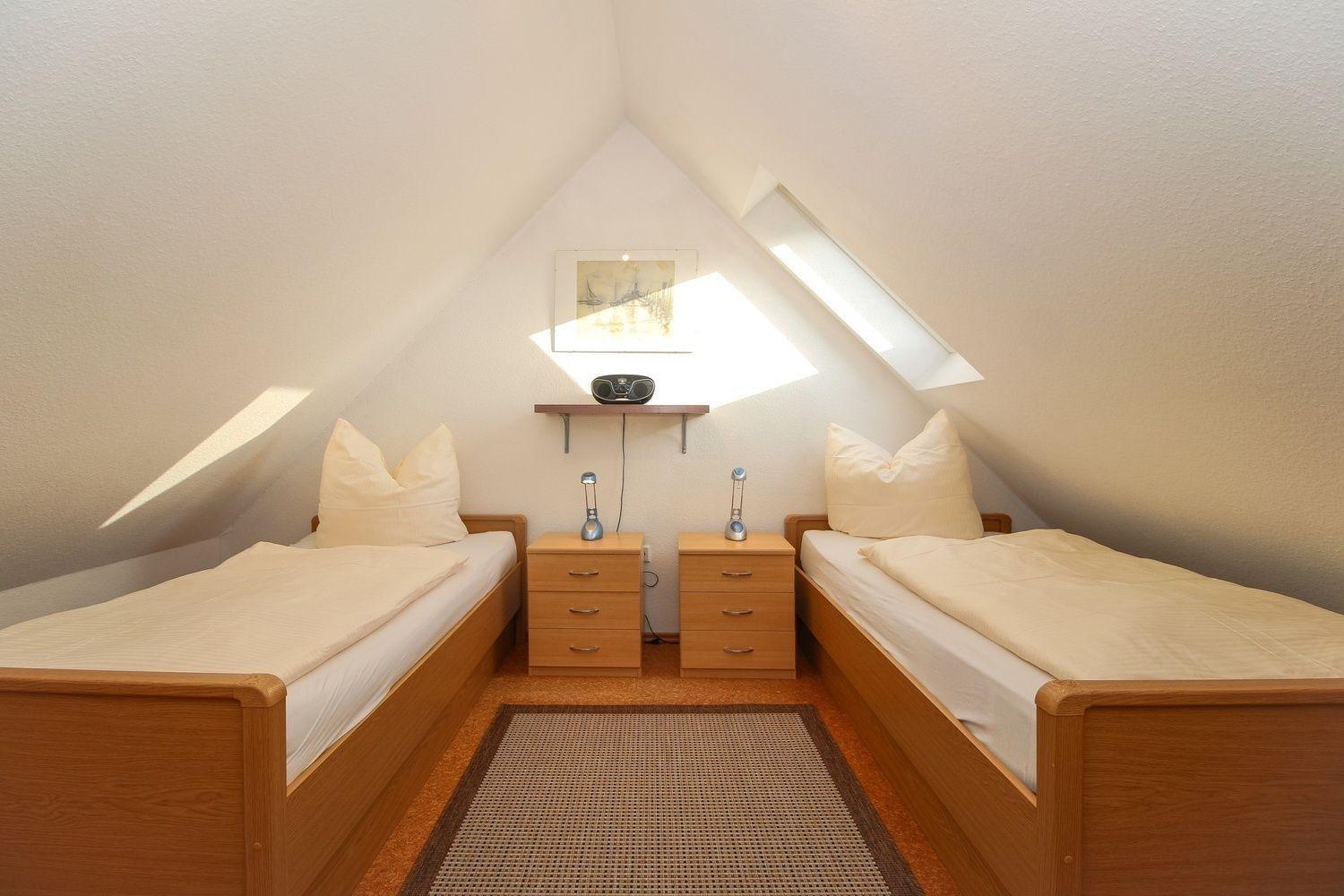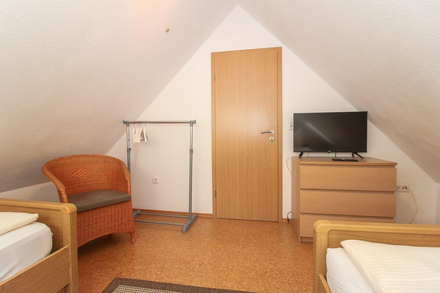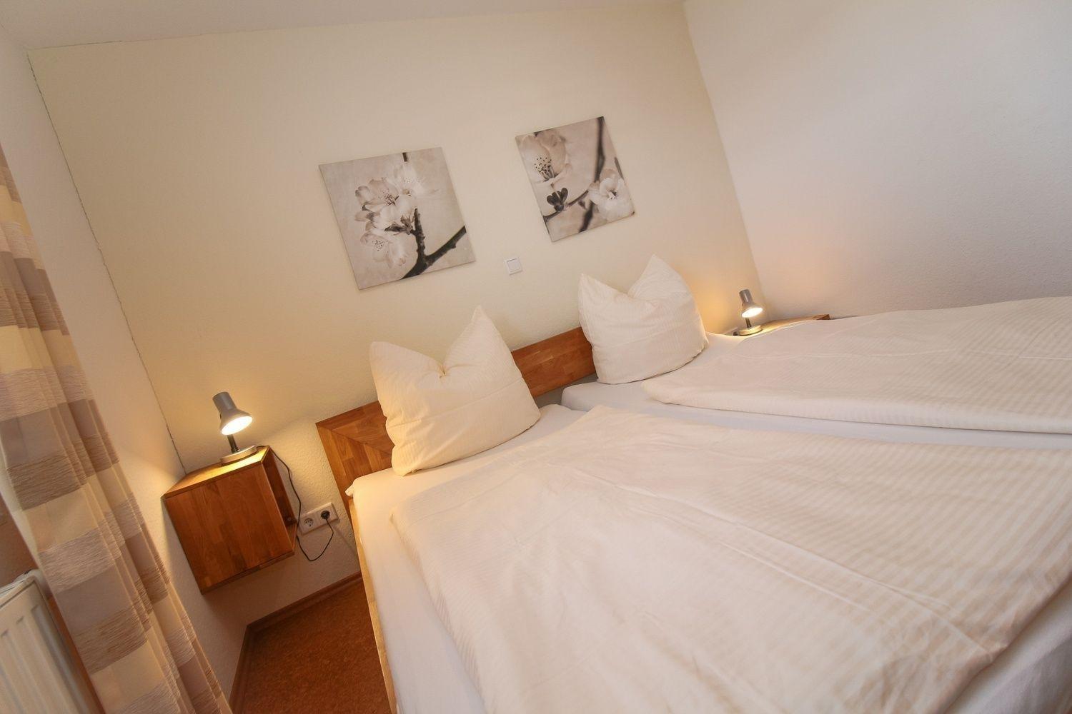 Das zweite Schlafzimmer beinhaltet zwei Einzelbetten eine Kommode und einen Fernseher.