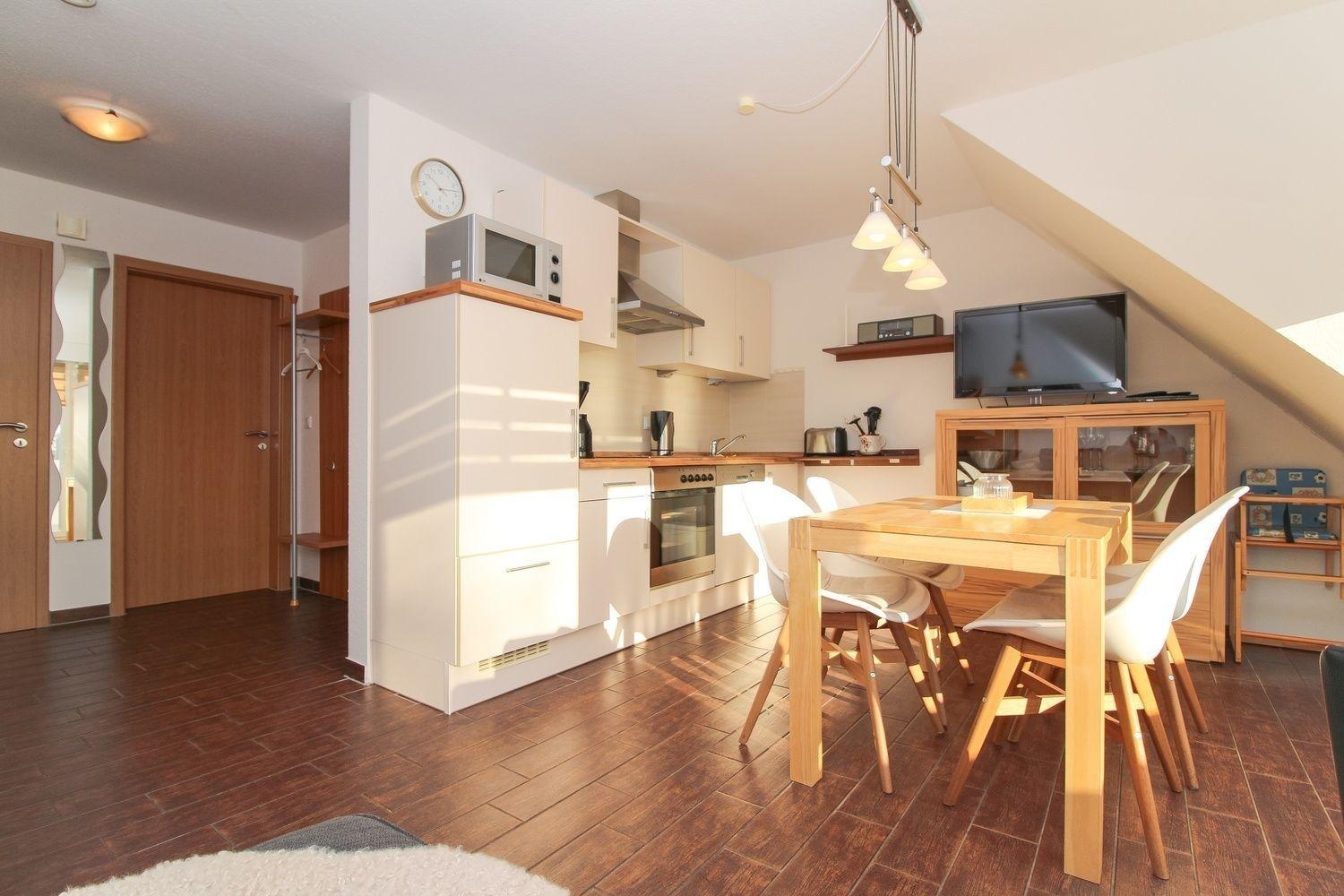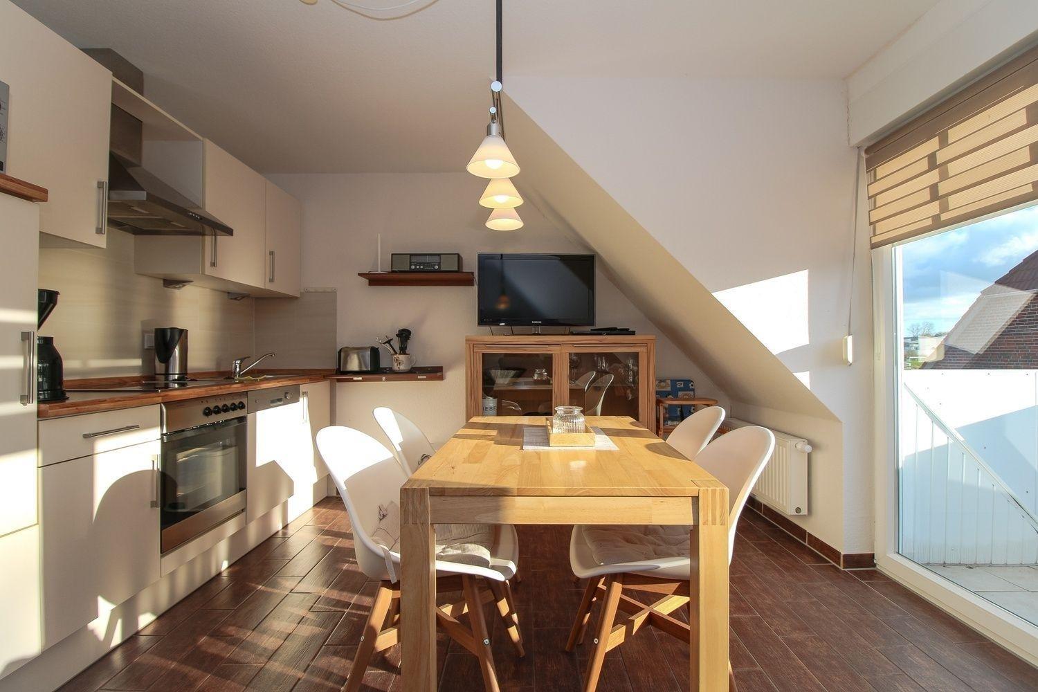Die Küche ist mit einem Herd (Ceranfeld), Backofen, einer Mikrowelle, Kühlschrank und einer Spülmaschine ausgerüstet. Zur weiteren Ausstattung gehören eine moderne Kaffeemaschine (und zusätzlich Pad-Maschine), Wasserkocher, Toaster sowie ausreichend Geschirr für 4 Personen. Direkt vor dem großen bodentiefen Fenstern befindet sich der Esstisch mit 4 Stühlen.