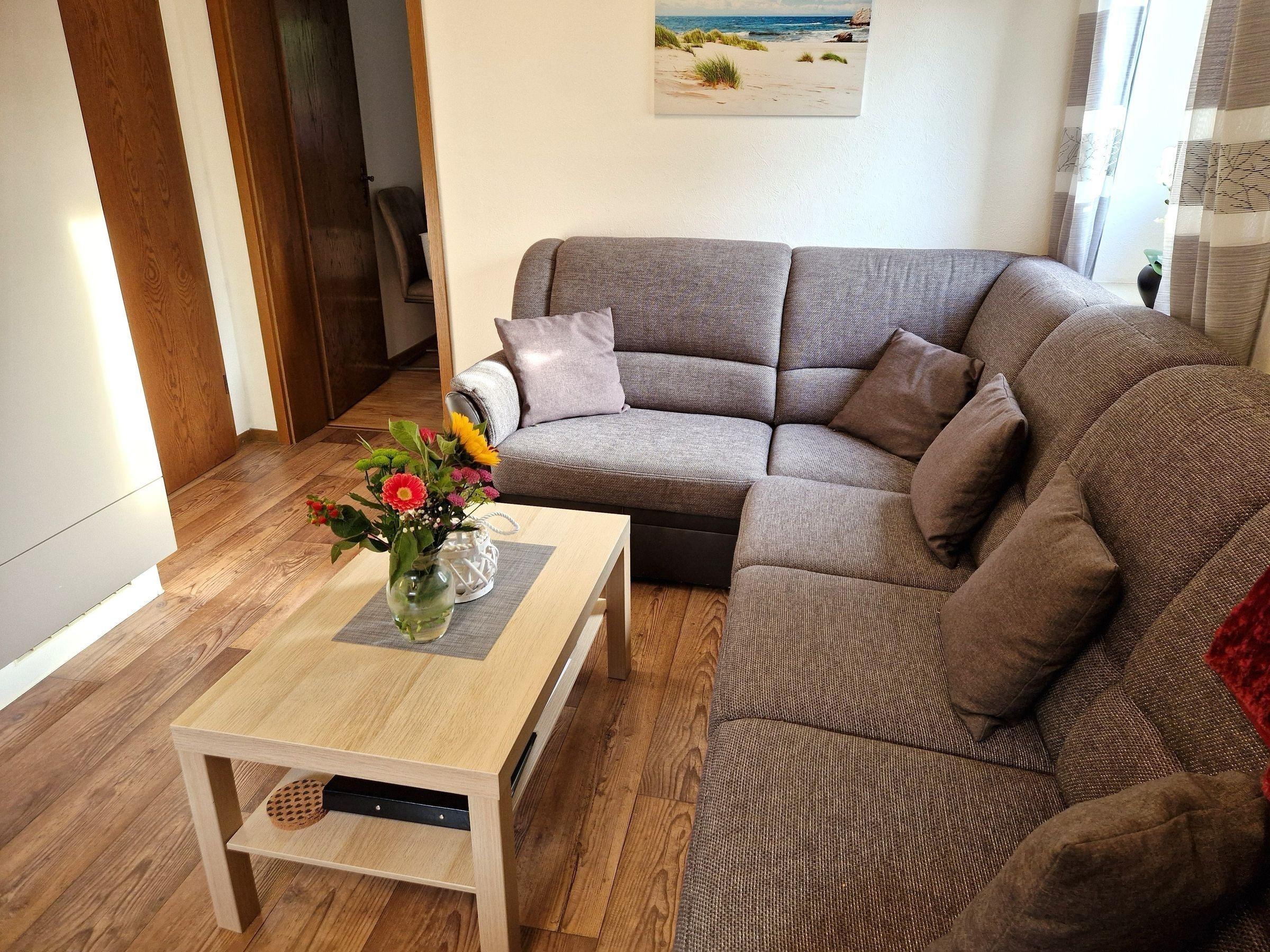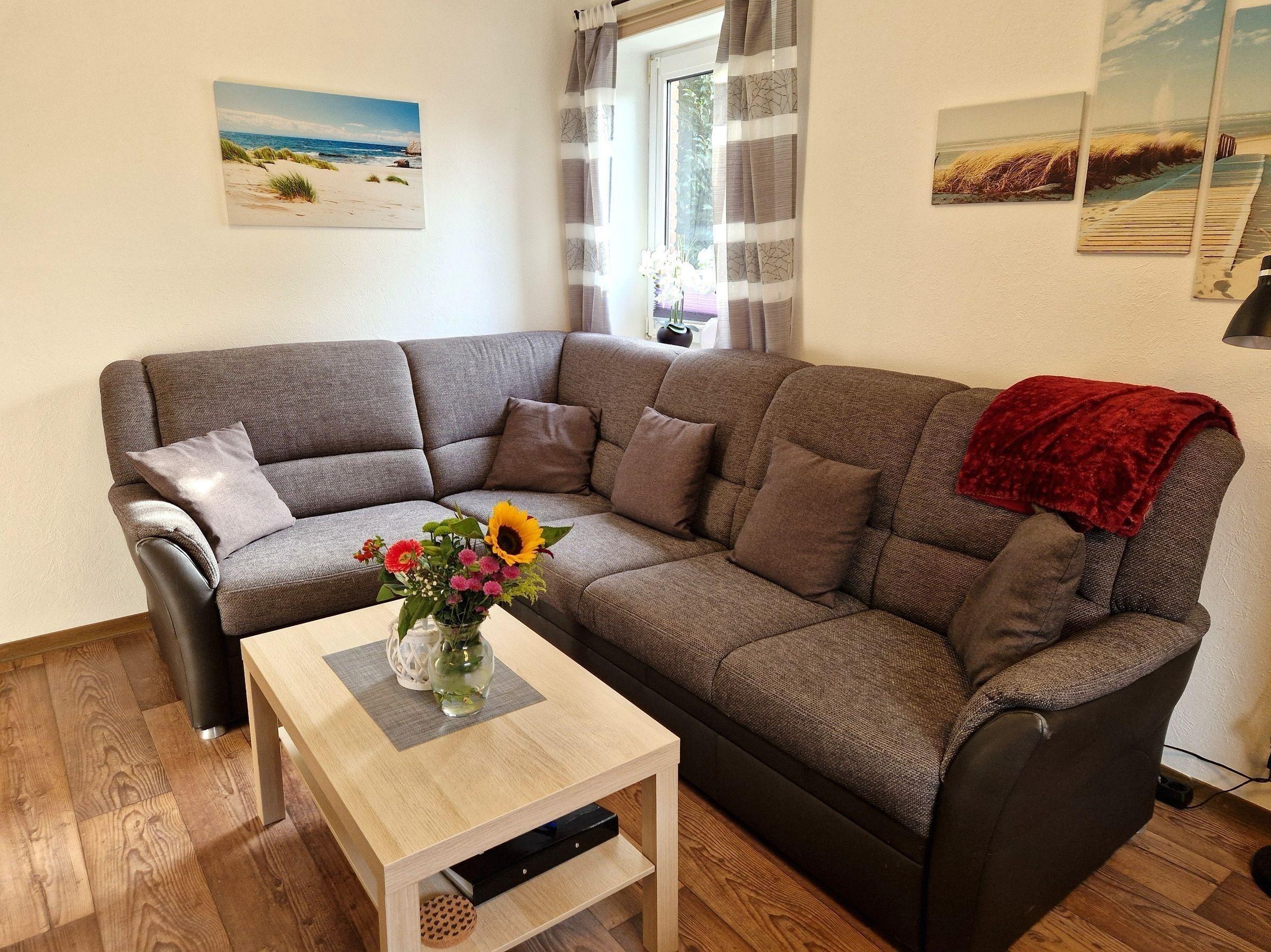 Die gemütliche Ferienwohnung im Erdgeschoss bietet auf etwa 40 m² Platz für 2 Personen und ein Baby. Sie umfasst einen einladenden Wohn-/Essbereich mit bequemer Sofagarnitur und großem Fernseher. Die gut ausgestattete Küchenzeile verfügt über einen Kühlschrank mit Gefrierfach, Backofen, Ceranfeld und Spülmaschine. Ein angrenzendes Schlafzimmer und ein modernes Duschbad ergänzen die Ausstattung.