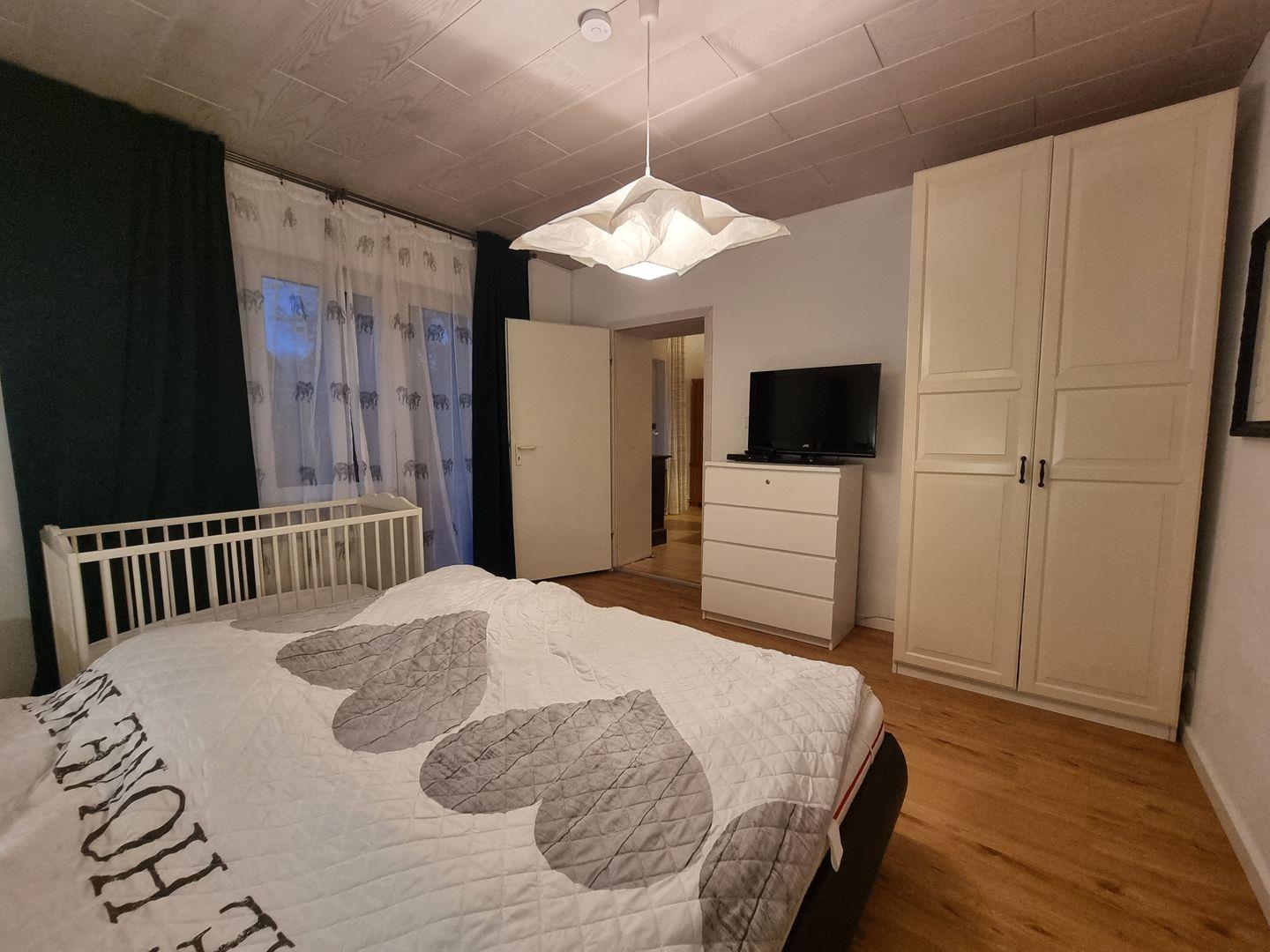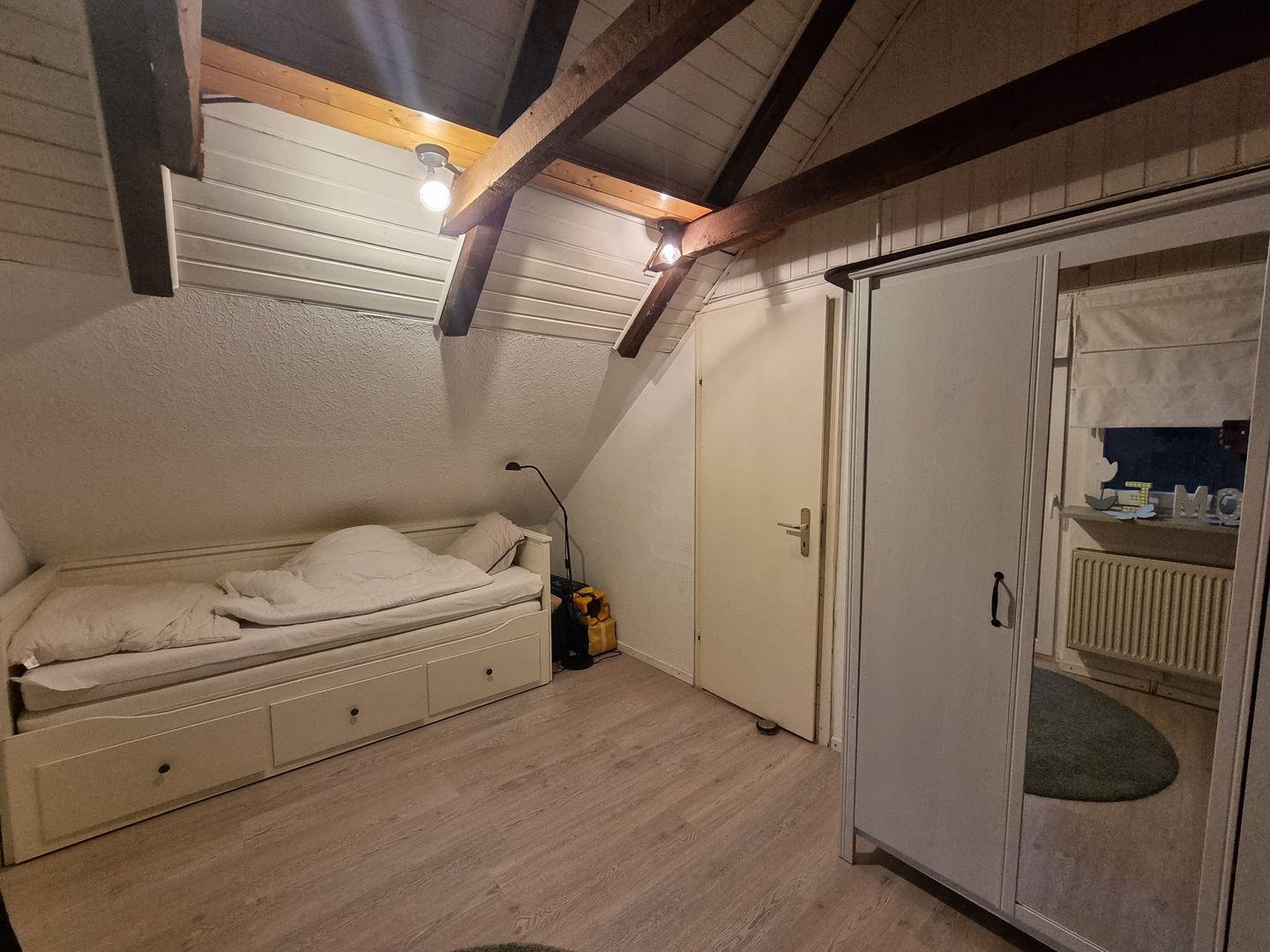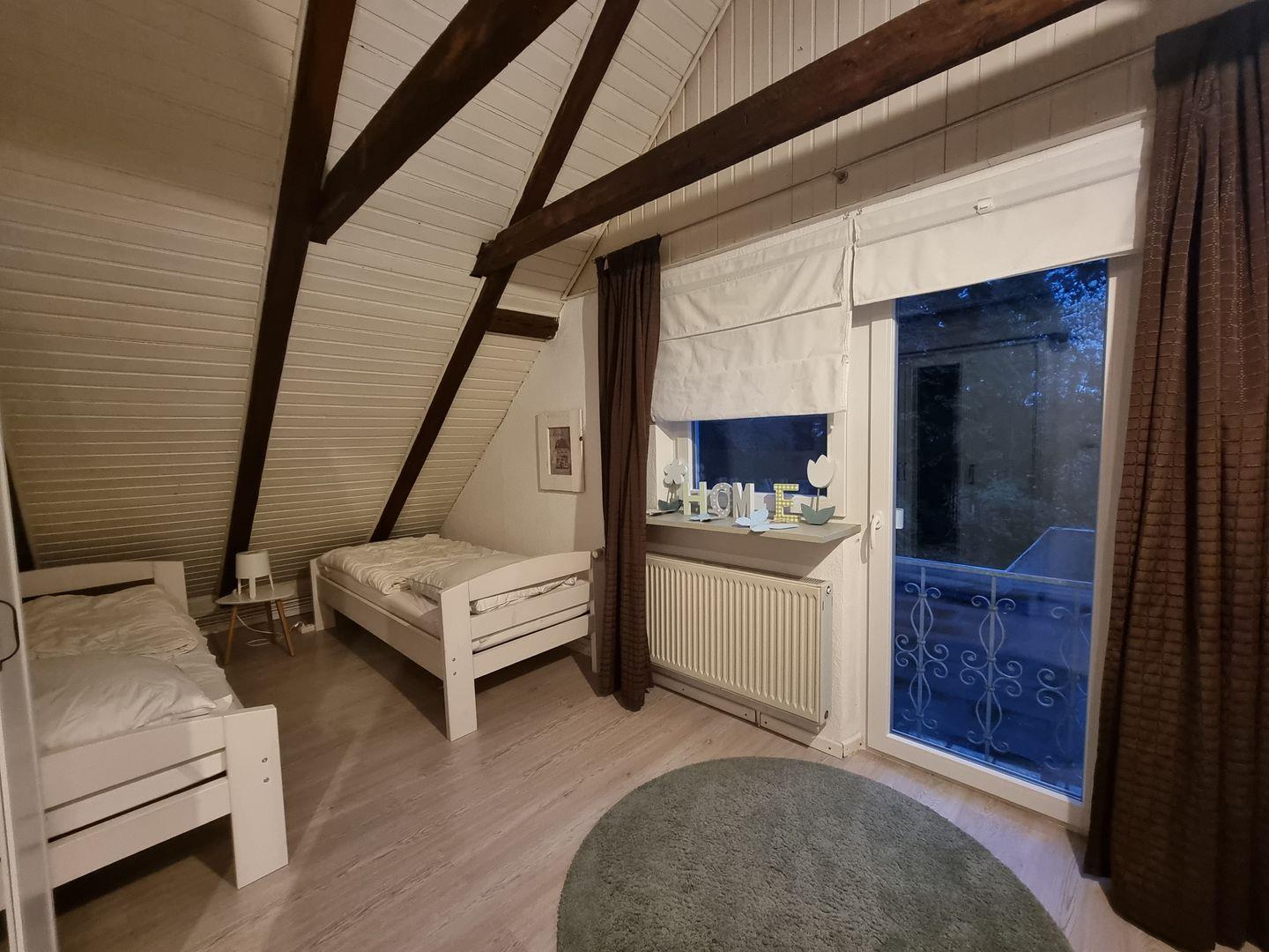 Erdgeschoss: Großes Schlafzimmer mit Doppelbett (180 x 200 cm) und eigenem Ensuite-Bad. Kleines Schlafzimmer mit Hemnes-Tagesbett, das auf 160 x 200 cm erweitert werden kann.