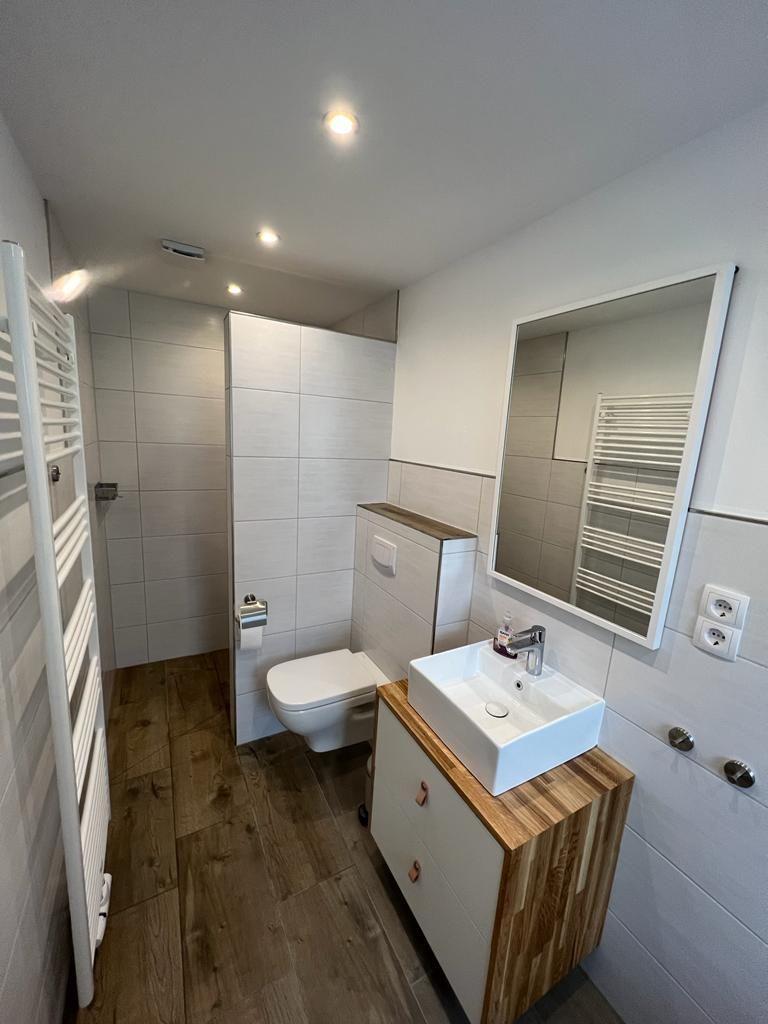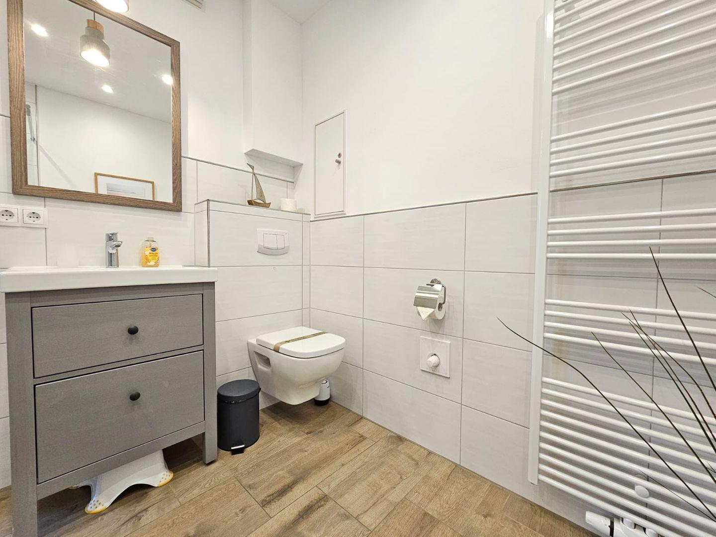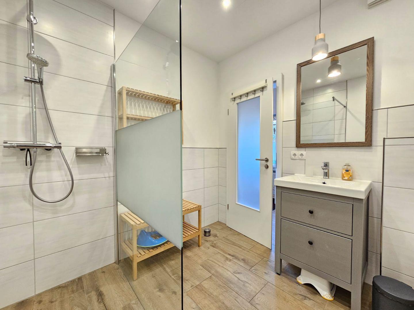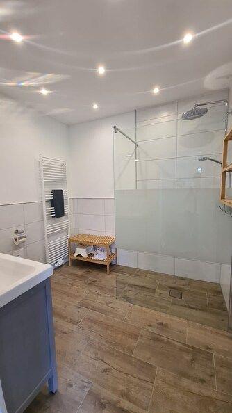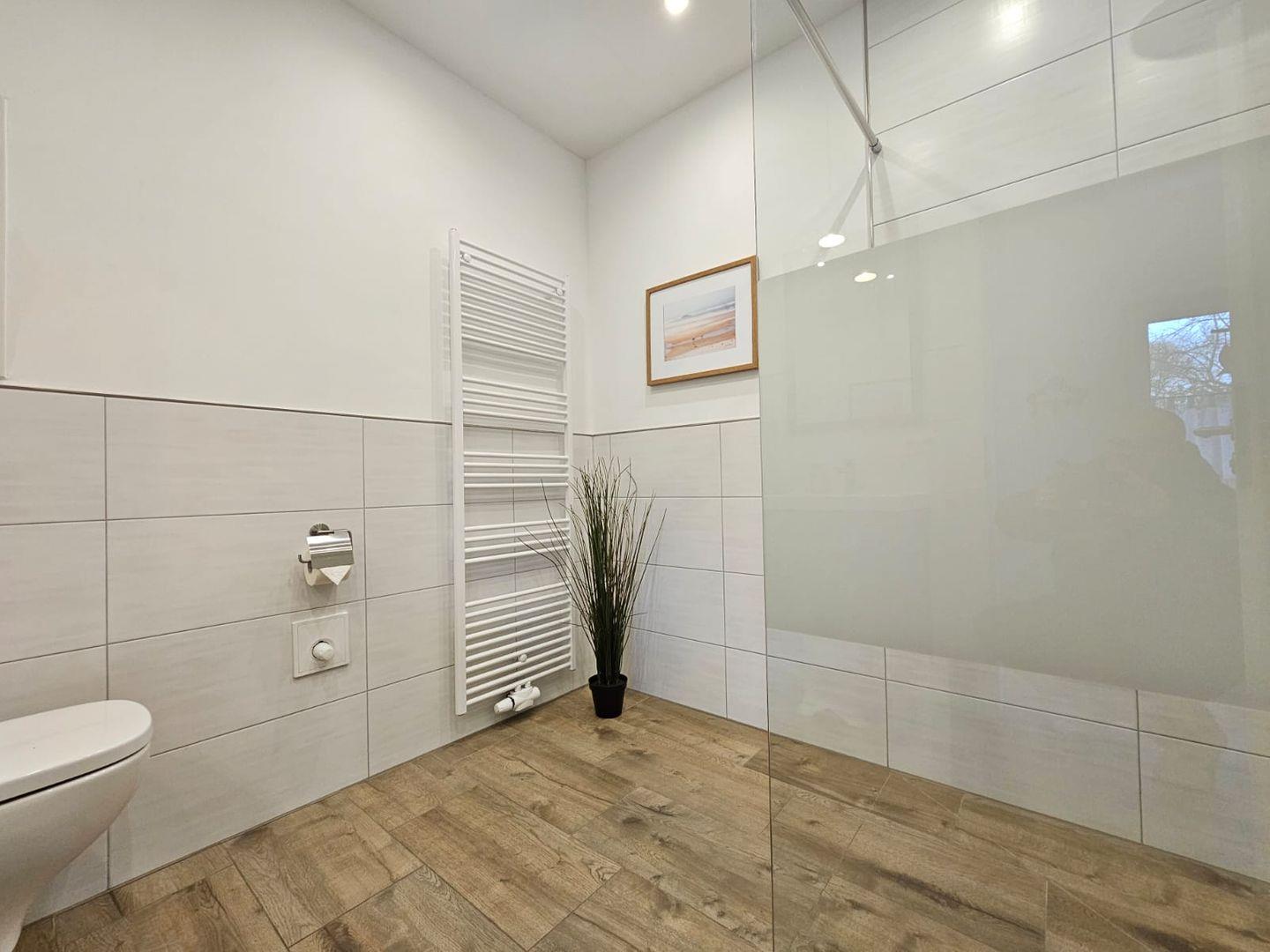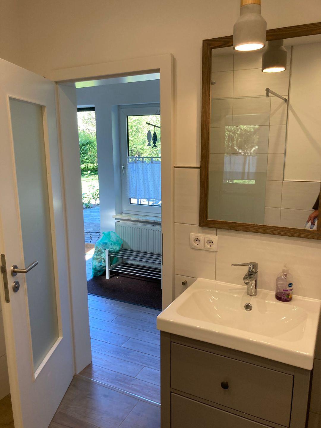 Neben dem Ensuite-Bad im Erdgeschoss gibt es ein Hauptbad, das vom Flur aus zugänglich ist, sowie ein zusätzliches Gäste-WC im Erdgeschoss, wodurch eine komfortable Nutzung für mehrere Personen gewährleistet ist.