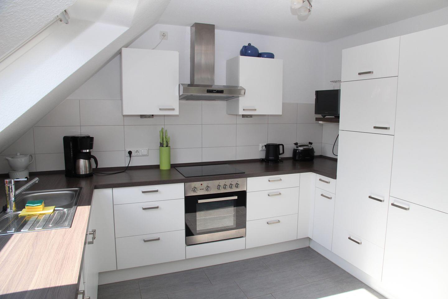 Die große moderne Einbauküche ist voll ausgestattet und verfügt über ein Cerankochfeld, Backofen, Geschirrspülmaschine, Kühlschrank mit Gefrierfach, Mikrowelle, Kaffeemaschine, Toaster, Wasserkocher, Eierkocher und ein Handrührgerät.
