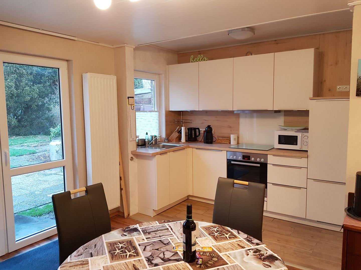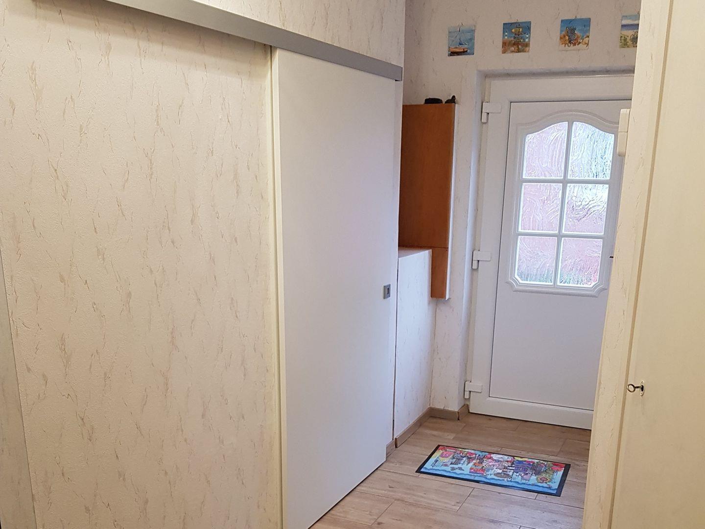 Ruhig und zentral gelegen. Wohn/Essbereich, Bad mit begehbarer Dusche/WC, Waschmaschine, 2 Schlafzimmer mit jeweils Doppelbetten, eine 5. Person könnte auf einem Gästebett/-hocker (ca. 70x190cm) schlafen, breite Türen, Terrasse, 2. TV-Gerät in einem Schlafzimmer. Die Außentür hat eine Breite von 85 cm. Im Ferienhaus haben die Türen eine Breite von 94 cm.