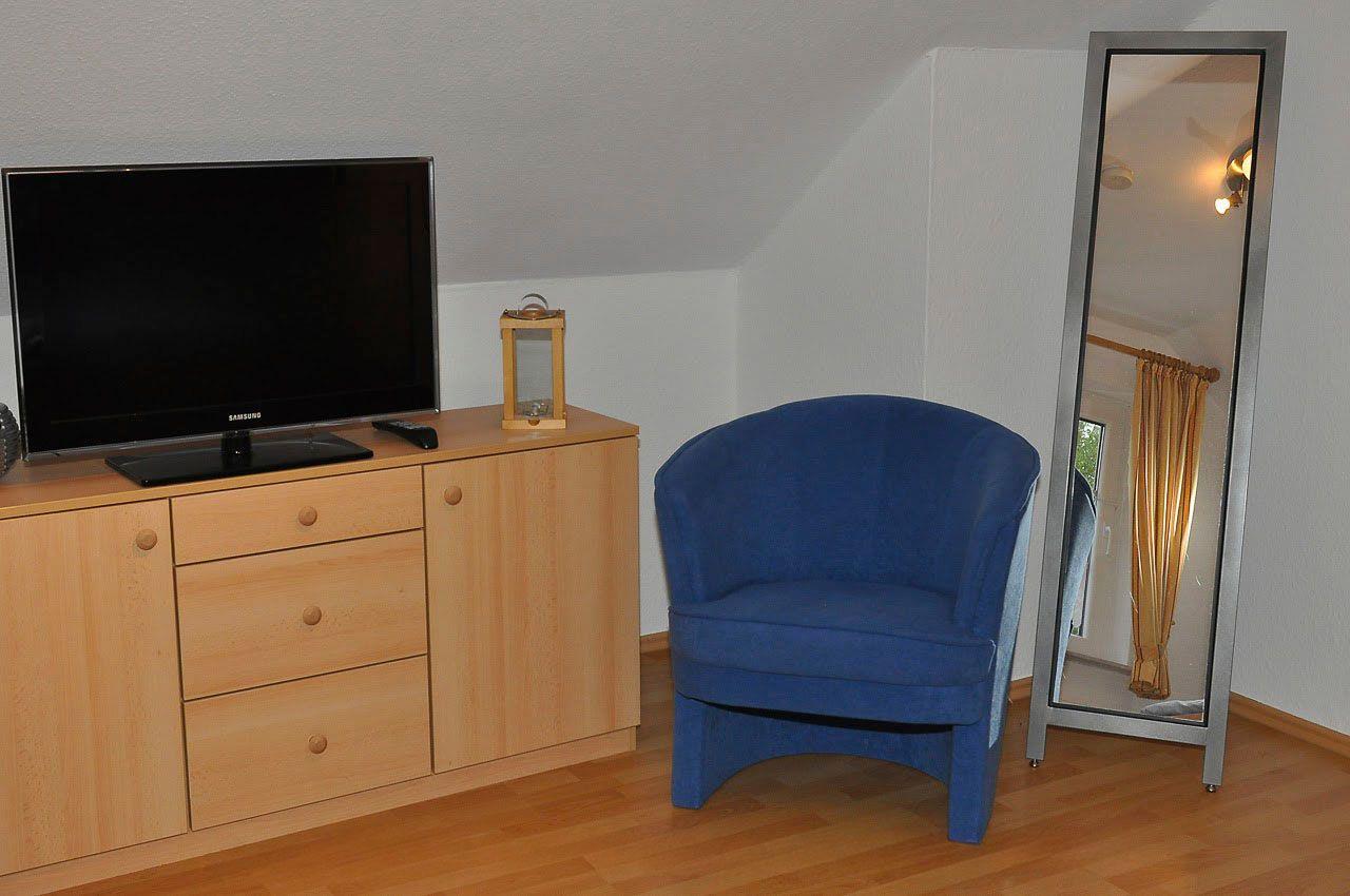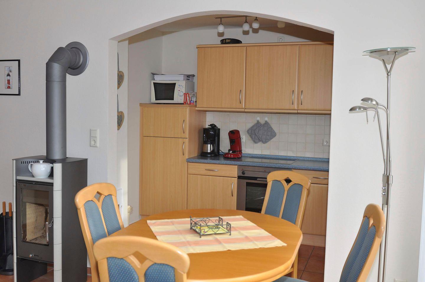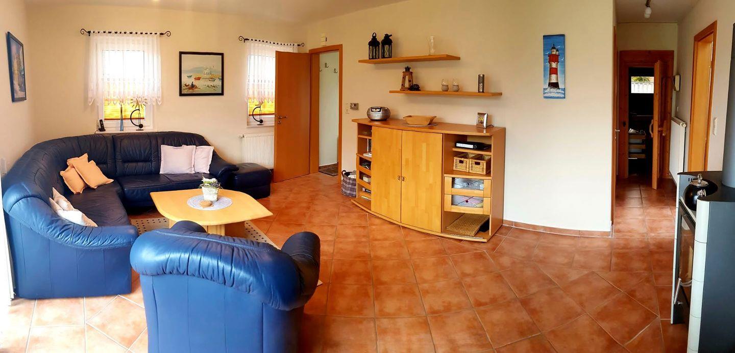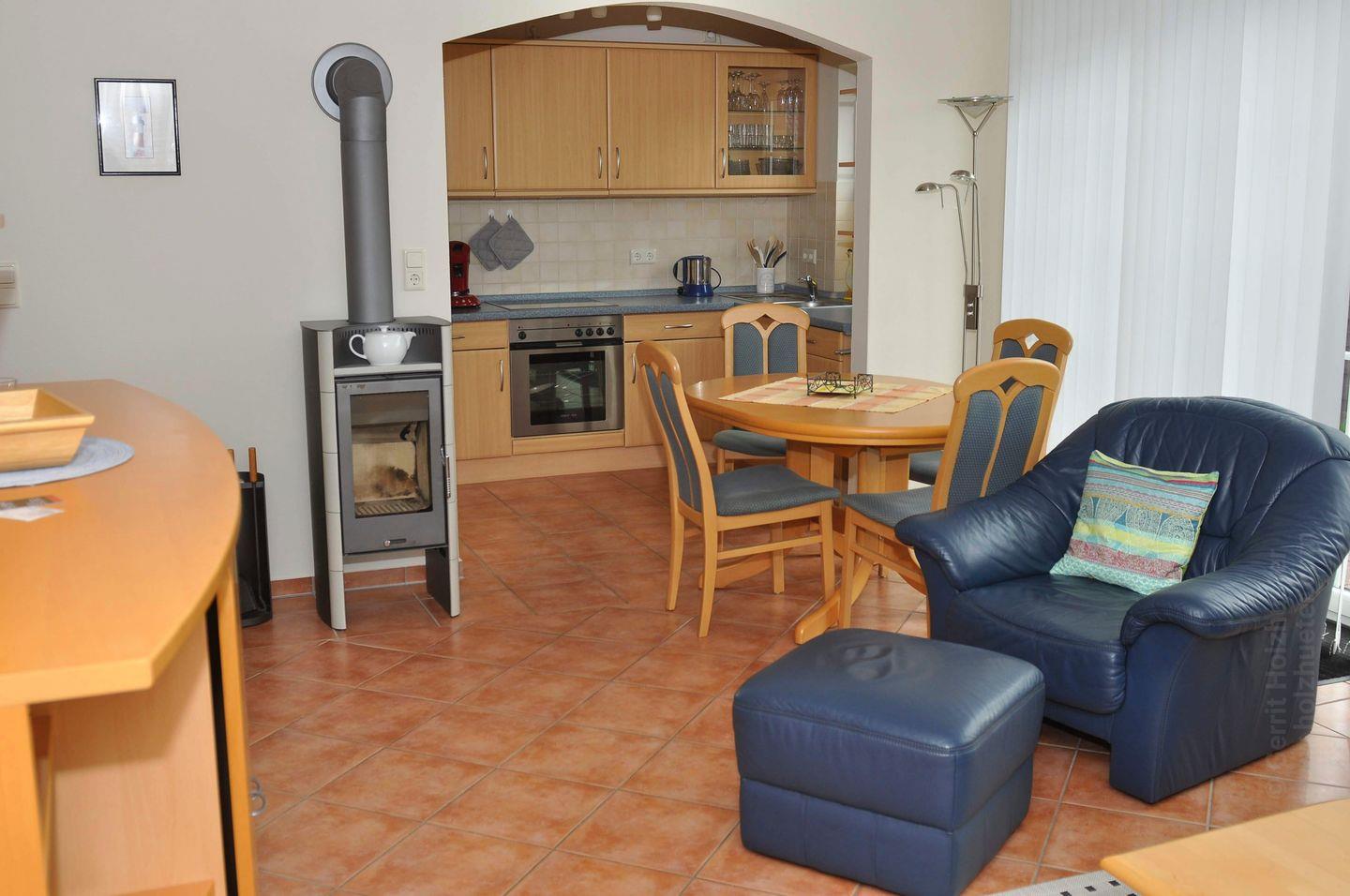 Das Wohnzimmer verfügt über einen Kaminofen, außerdem steht unseren Gästen eine Sauna im Haus zur Verfügung.