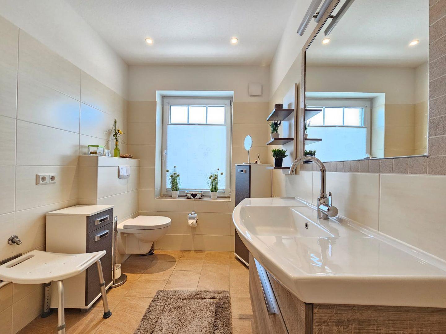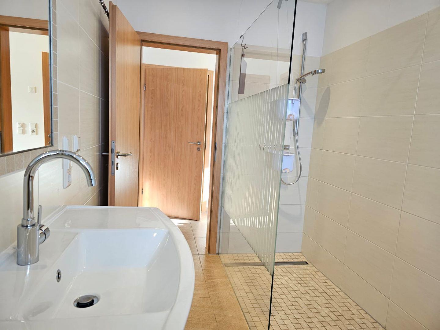 Modernes Badezimmer mit Dusche, Waschbecken und WC.