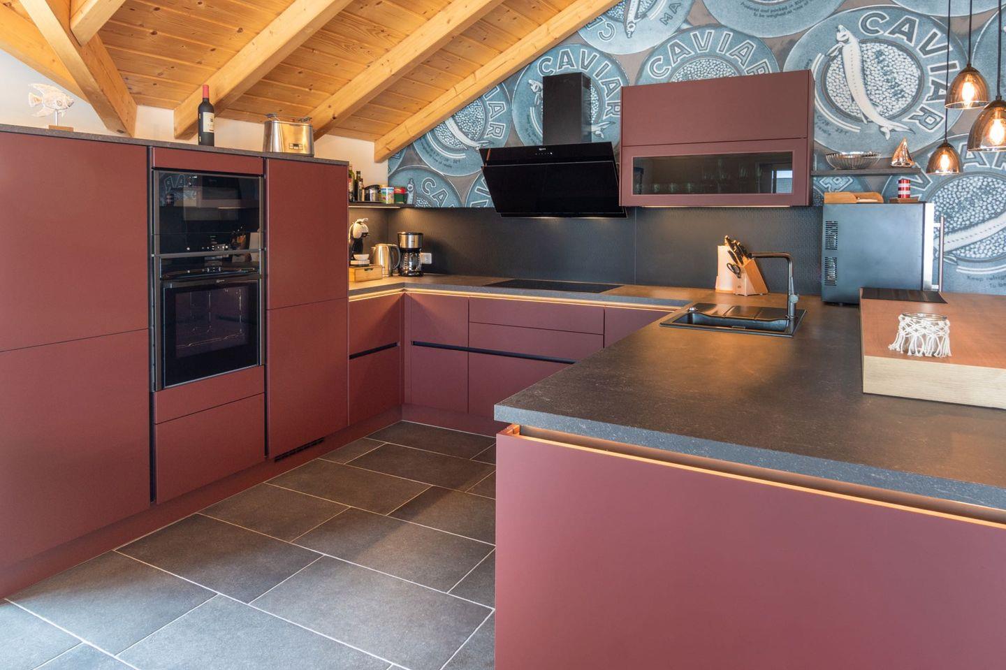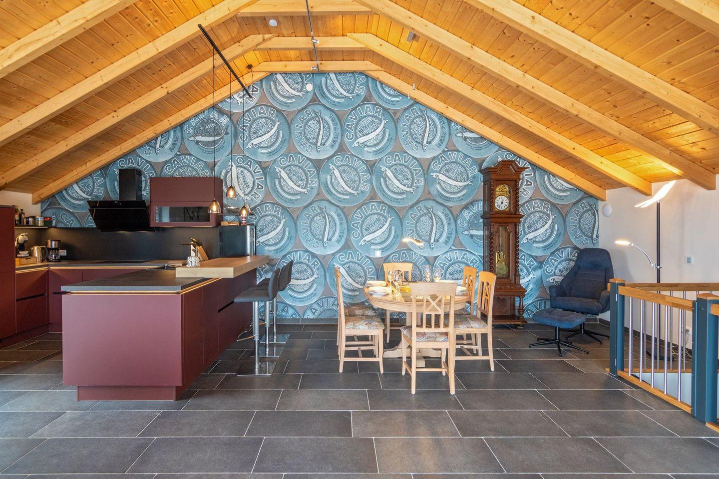 Moderne Küche: Voll ausgestattet mit hochwertigen Geräten wie Herd, Backofen, Geschirrspüler, Kaffeemaschine und Kühlschrank. Ideal für Selbstversorger und kulinarische Erlebnisse.