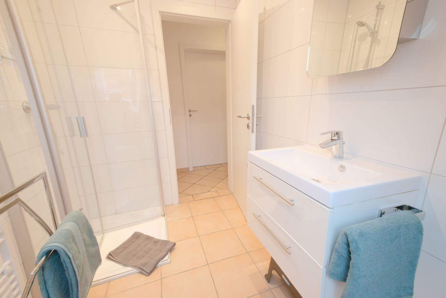 Im Badezimmer ist eine Dusche mit flachem Einstieg. Das große Wohnzimmer ist mit zwei Ledercouches, sowie TV ausgestattet.