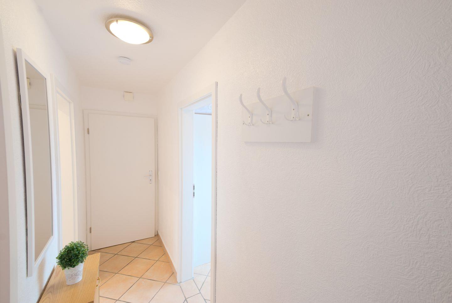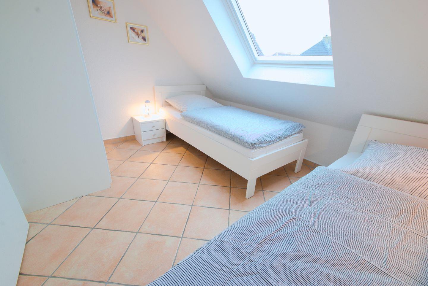 Die Wohnung Möwe 3 befindet sich im Obergeschoss eines ruhig gelegenen Wohnhauses. Die Wohnung ist freundlich hell eingerichtet und verfügt über zwei Schlafzimmer. In einem ein Doppelbett und Kleiderschrank. Im anderen zwei Einzelbetten und Kleiderschrank.