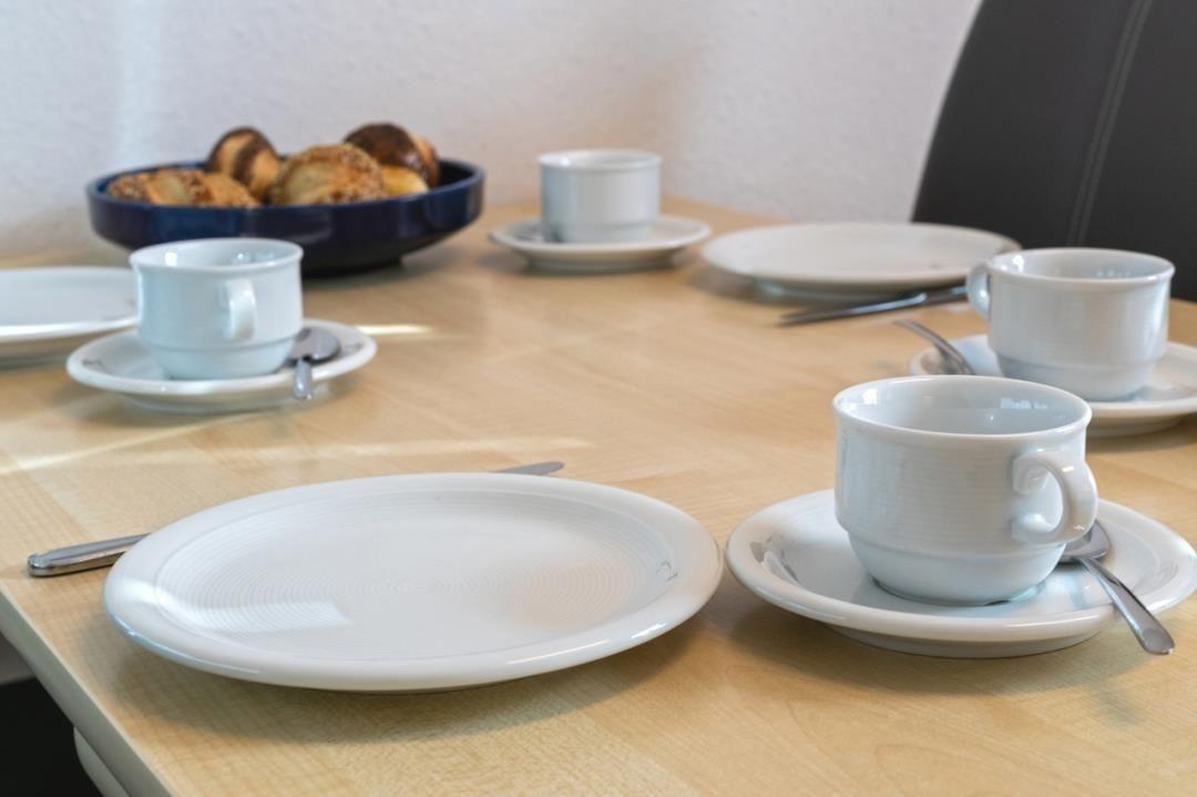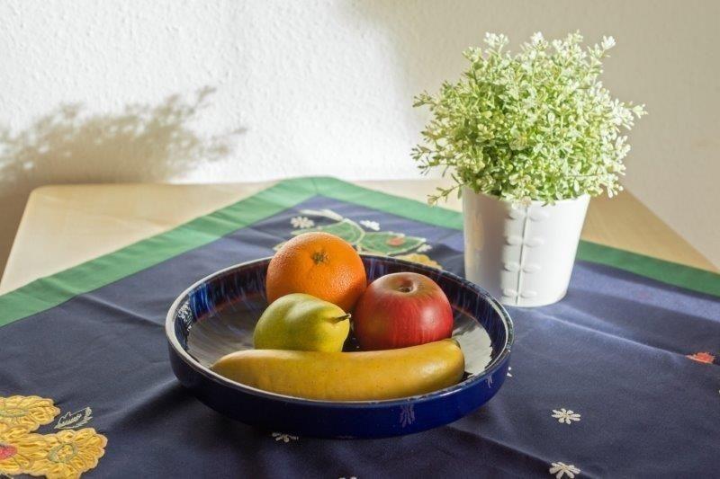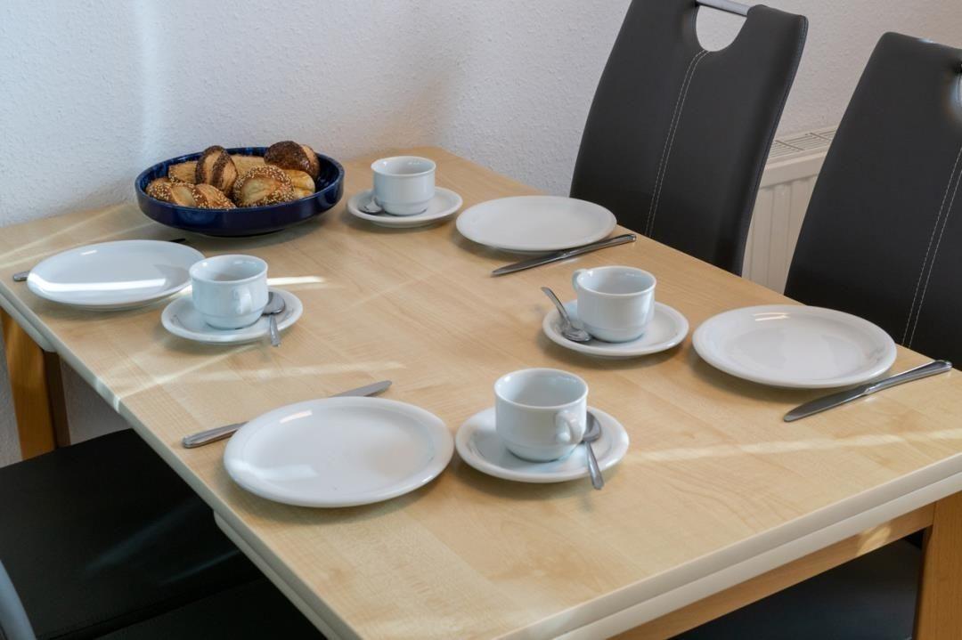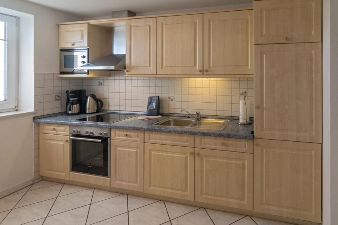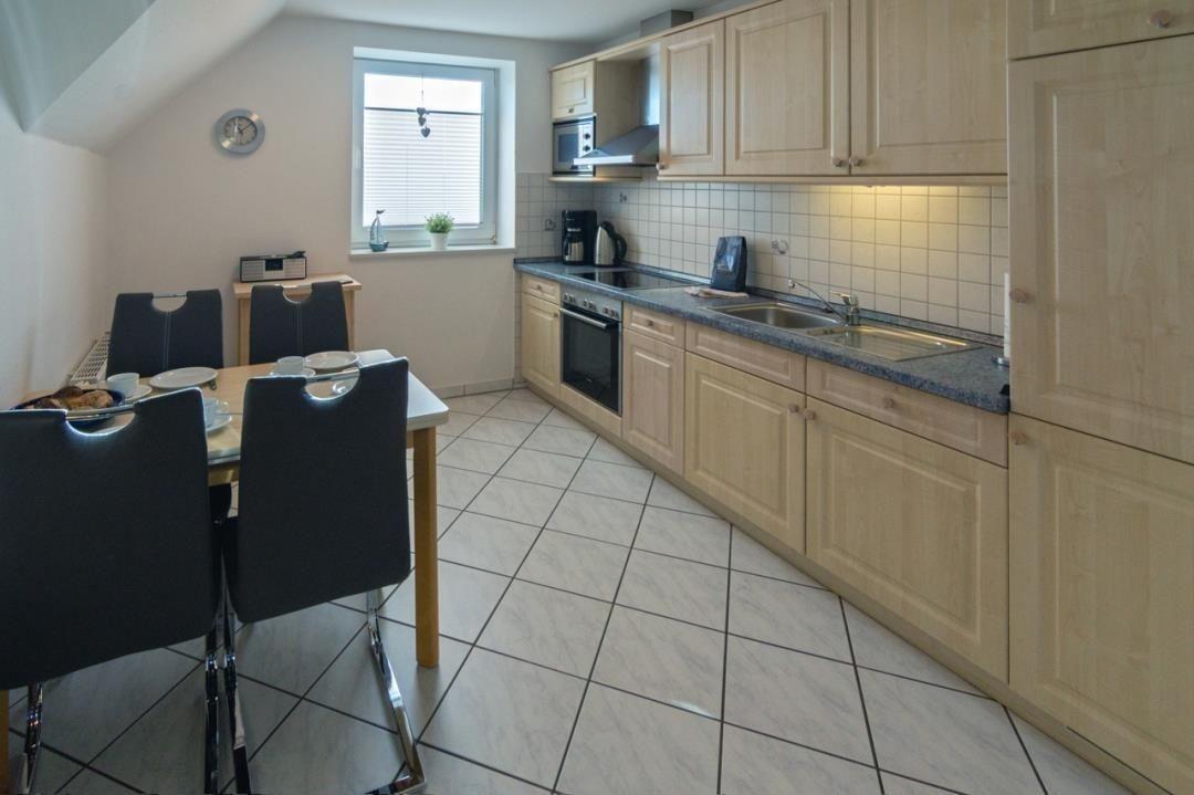 Die Küchenzeile der Wohnung wurde ansprechend ausgestattet und verfügt neben einem Backofen und einem Ceranfeld (mit Abzug) auch über einen Kühlschrank mit Gefrierfach. Auch eine Mikrowelle steht Ihnen hier zur Verfügung. Zusätzlich zur Einbauküche verfügt der Küchenbereich auch über eine gemütliche Sitzgruppe. Vier Stühle und der Esstisch bieten hier genügen Platz für alle Gäste.