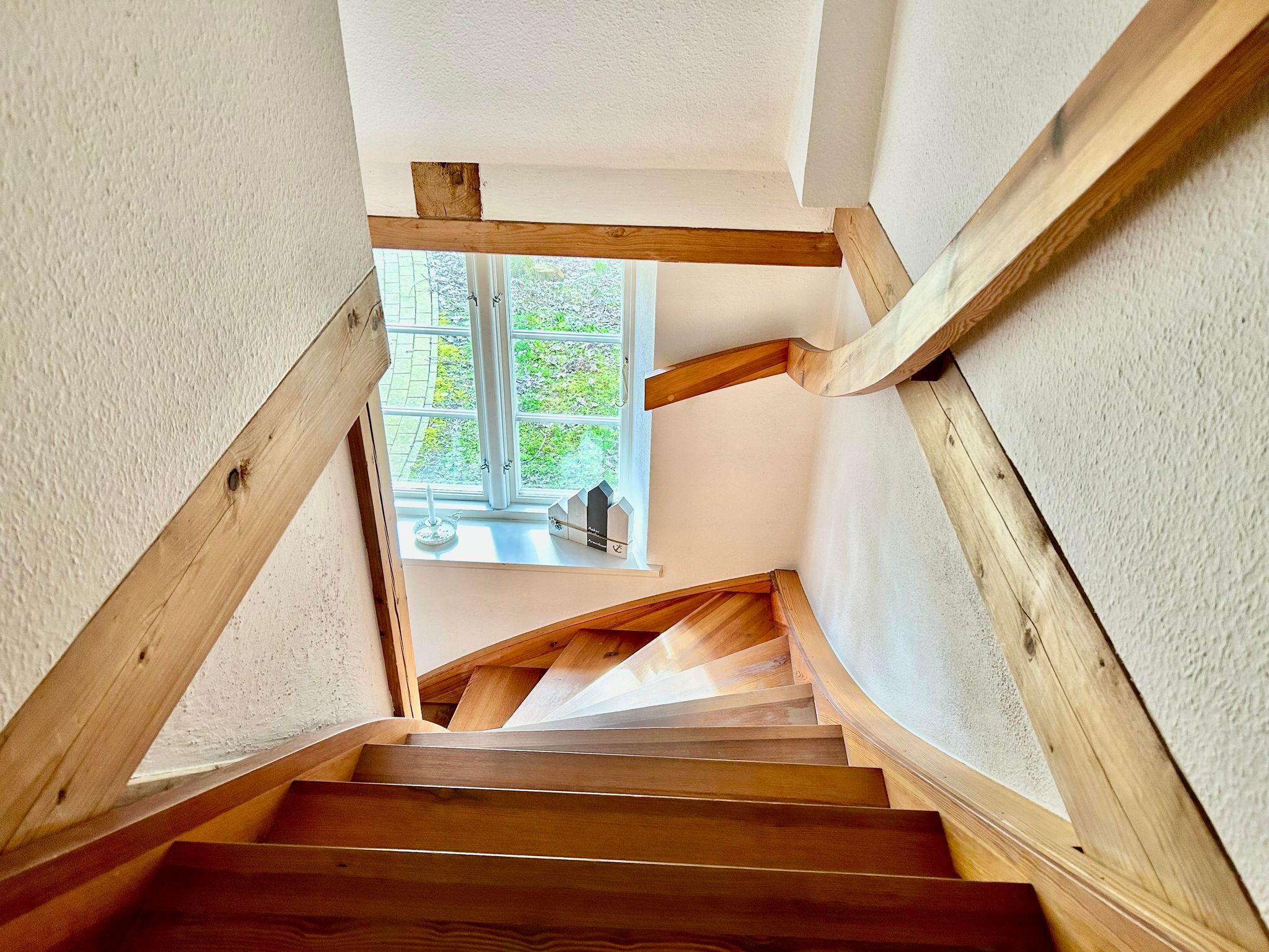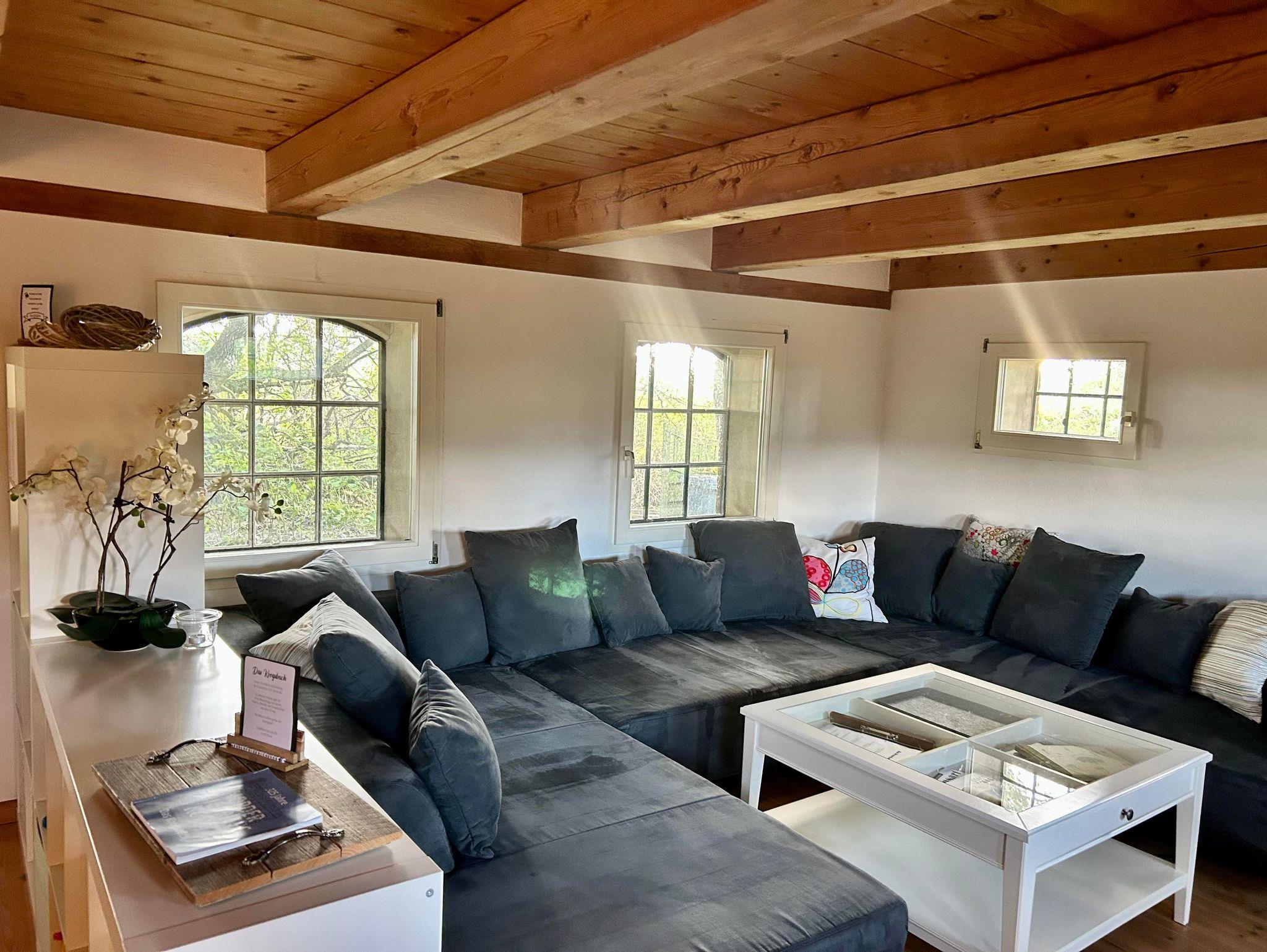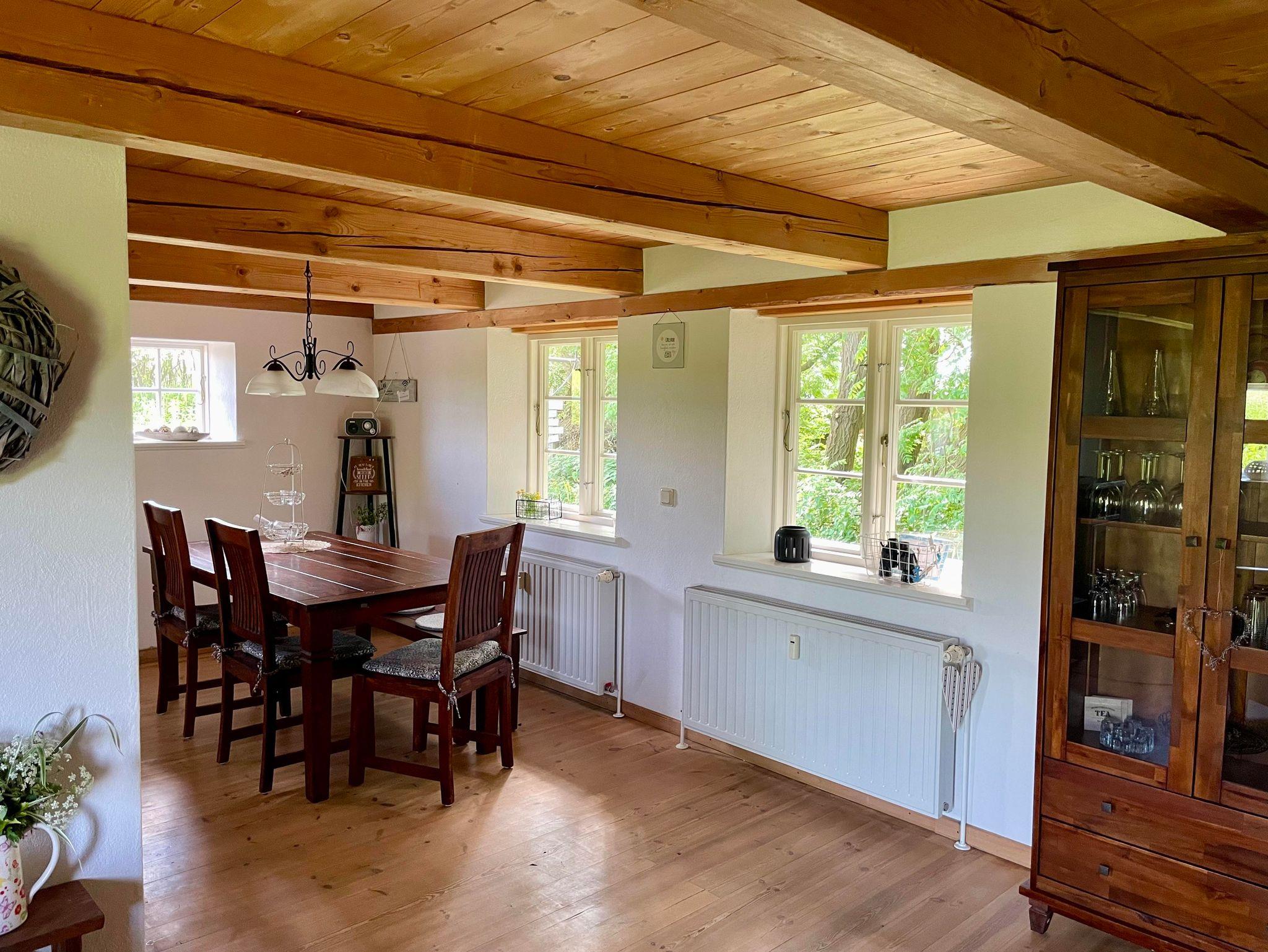 Alle Räume sind hell und lichtdurchflutet mit Holzböden (außer Bäder und Küche), Holzdecken und sichtbarem Ständerwerk.