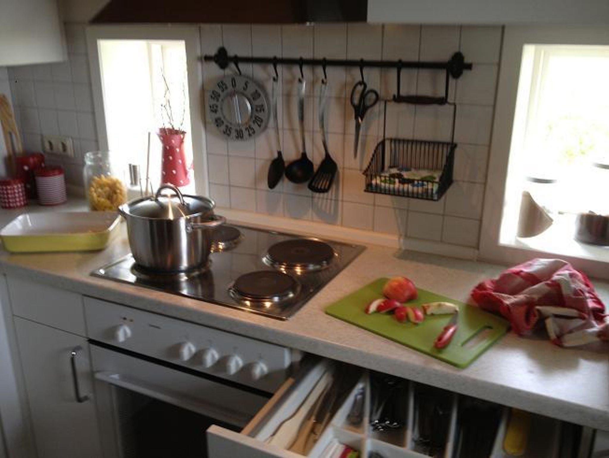 Herd, Backofen, Kühlschrank mit Gefrierfach, Geschirrspülmaschine, Kaffeemaschine, Wasserkocher, Toaster, verschiedenste Kochuntensilien, ausreichend Geschirr und genügend Stellfläche.