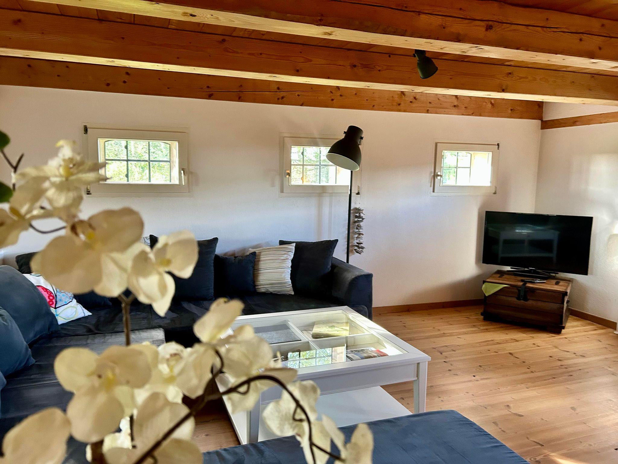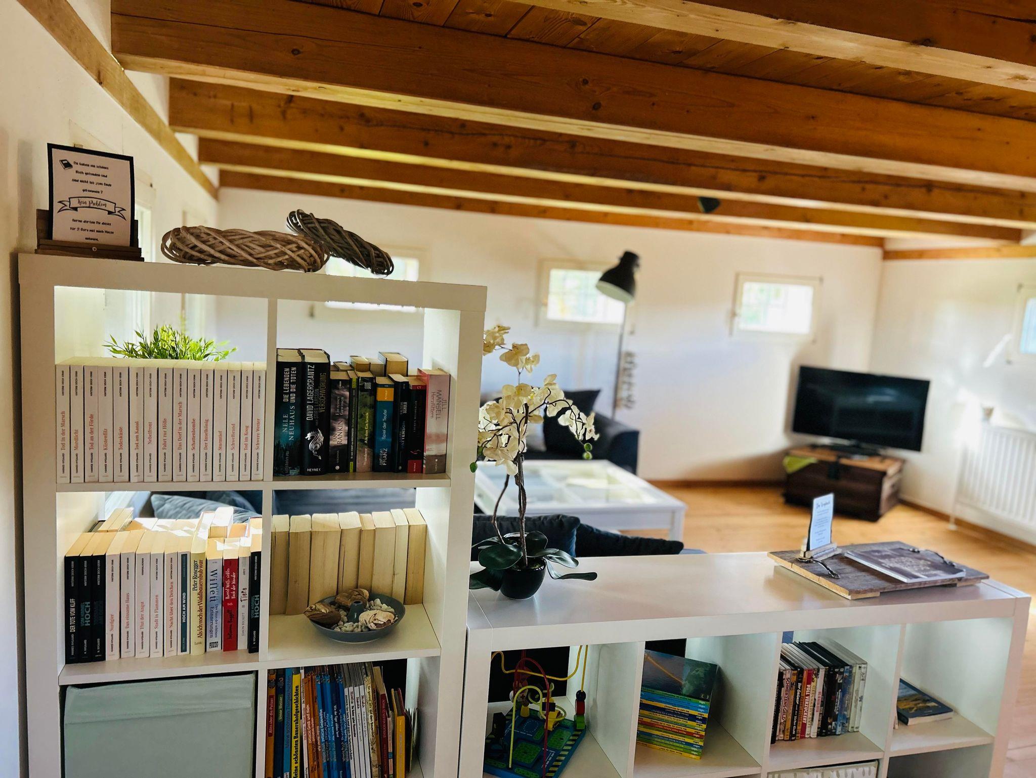 Das Wohnhimmer ist ausgestattet mit einem Flachbildfernseher, DVD-Player, Musikanlage und einer Auswahl an verschiedenen Büchern.