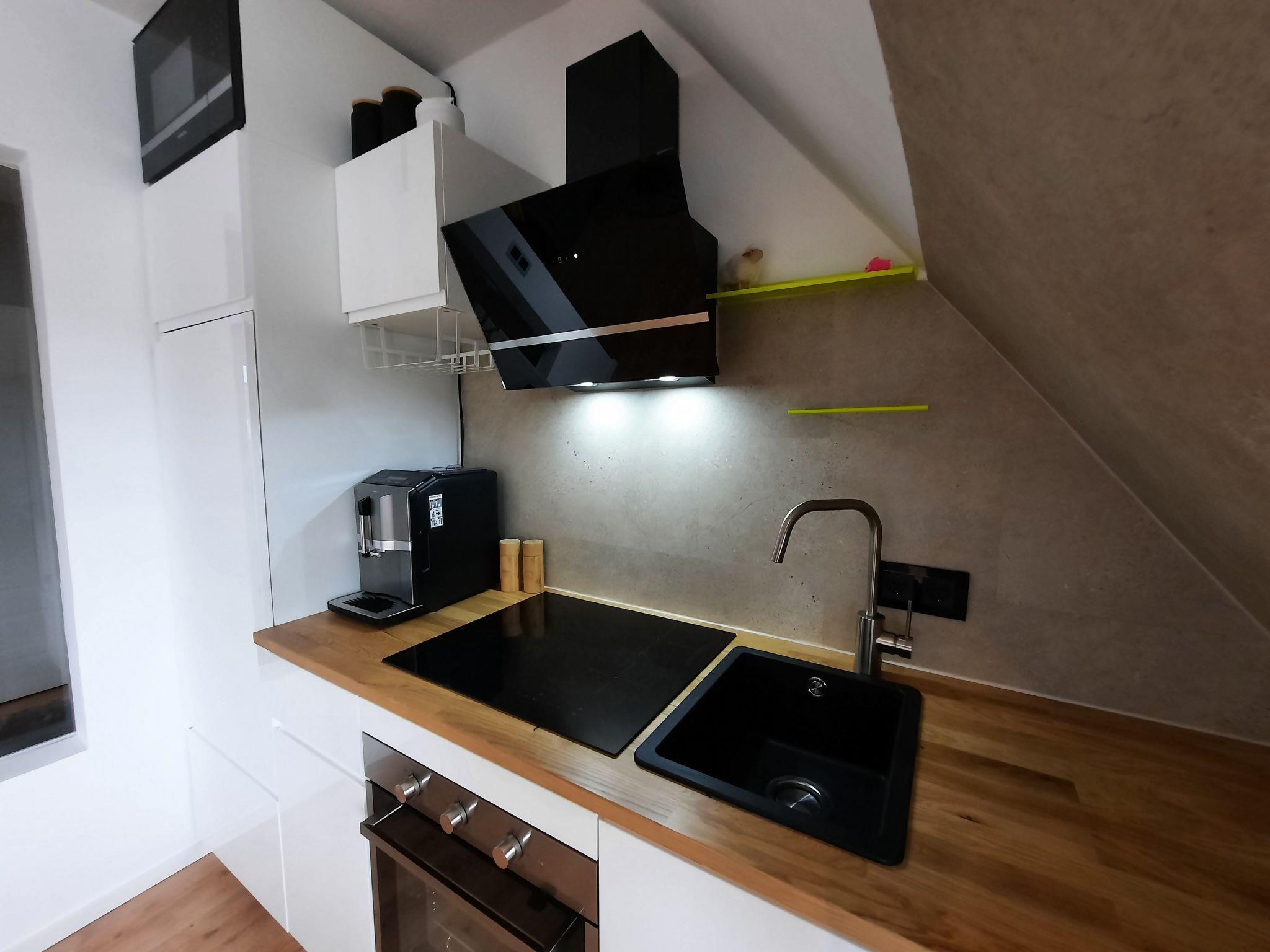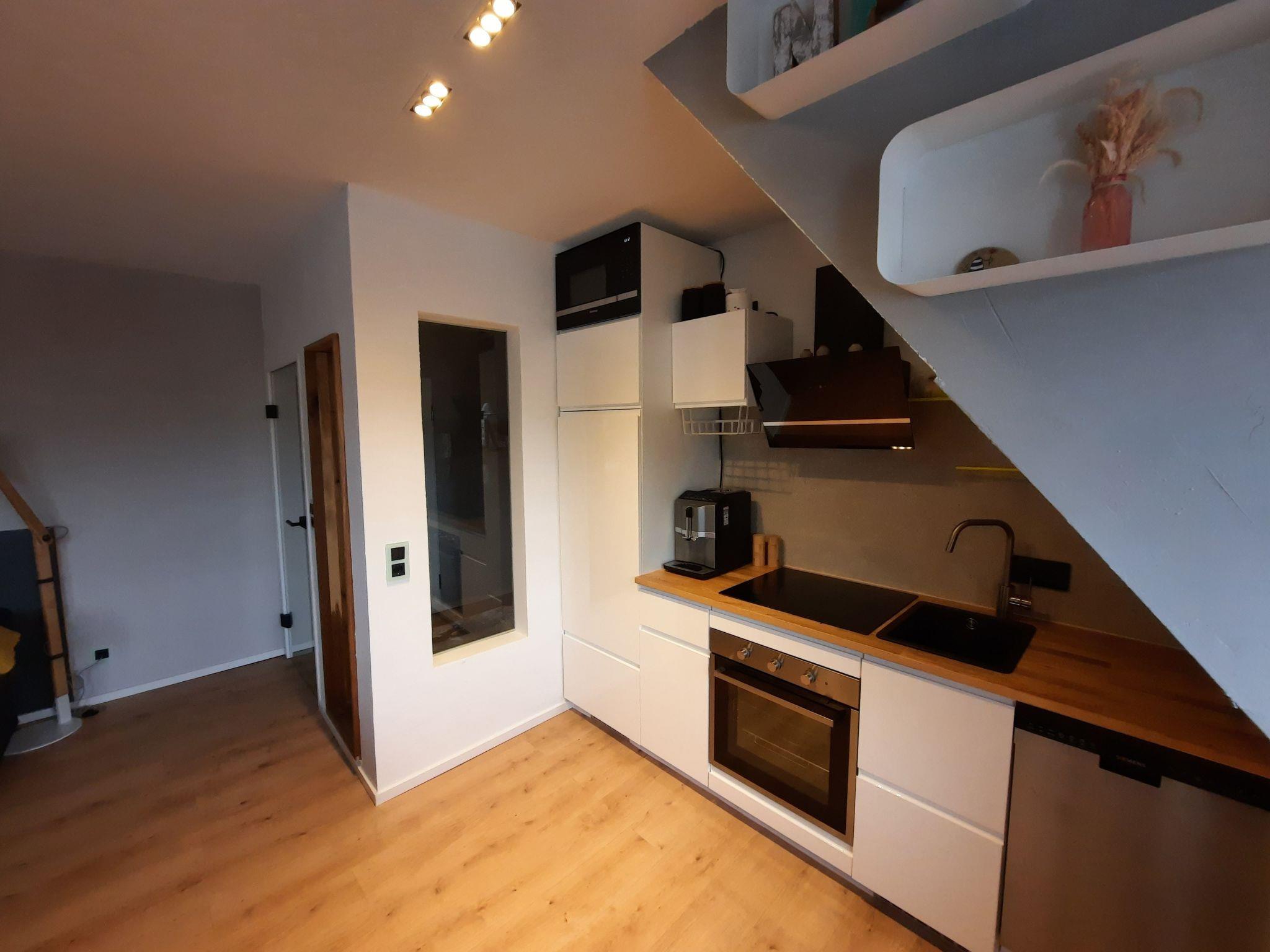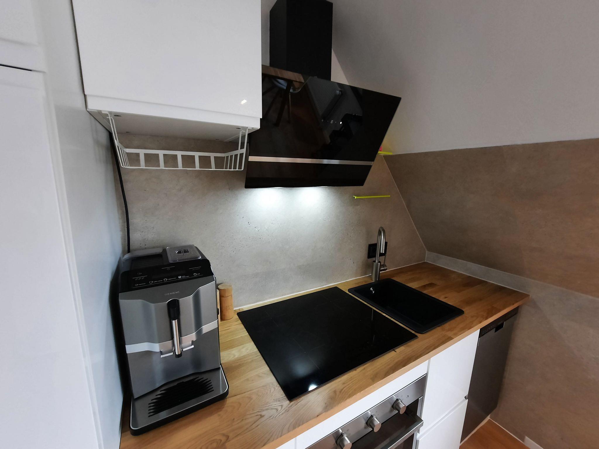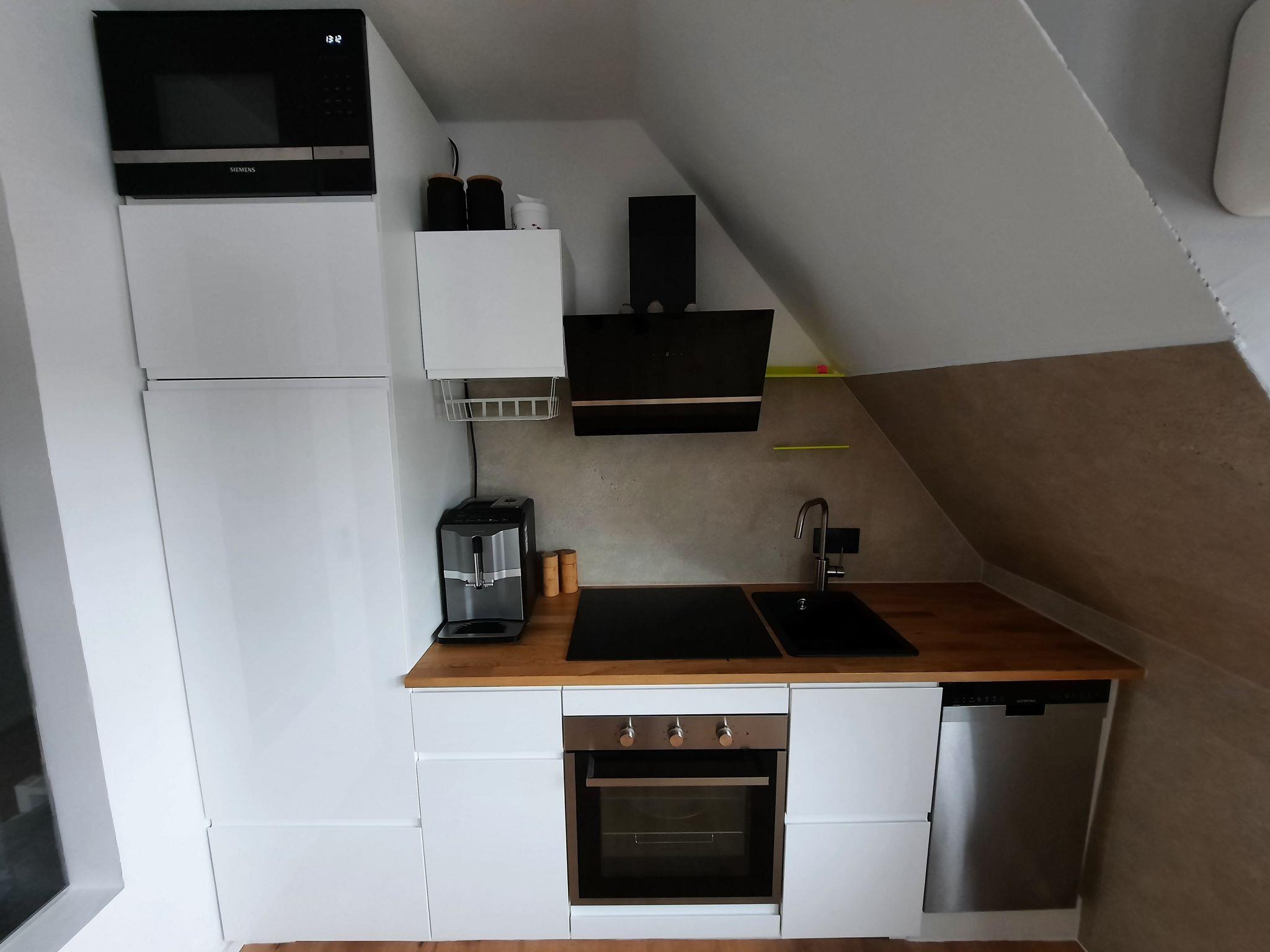 Die Küche ist mit allen nötigen Utensilien wie Kühlschrank inkl. Gefrierfach, Wasserkocher, Mikrowelle mit Grillfunktion, elektrischer Stabmixer, Toaster, Kaffeevollautomat, Backofen, Induktionskochfeld, Spülmaschine etc. ausgestattet. Geräte überwiegend von Siemens. Vom angrenzenden Essplatz aus hat man einen schönen Ausblick über die Dächer Norderneys. Genießen Sie hier Ihre zubereiteten Speisen.