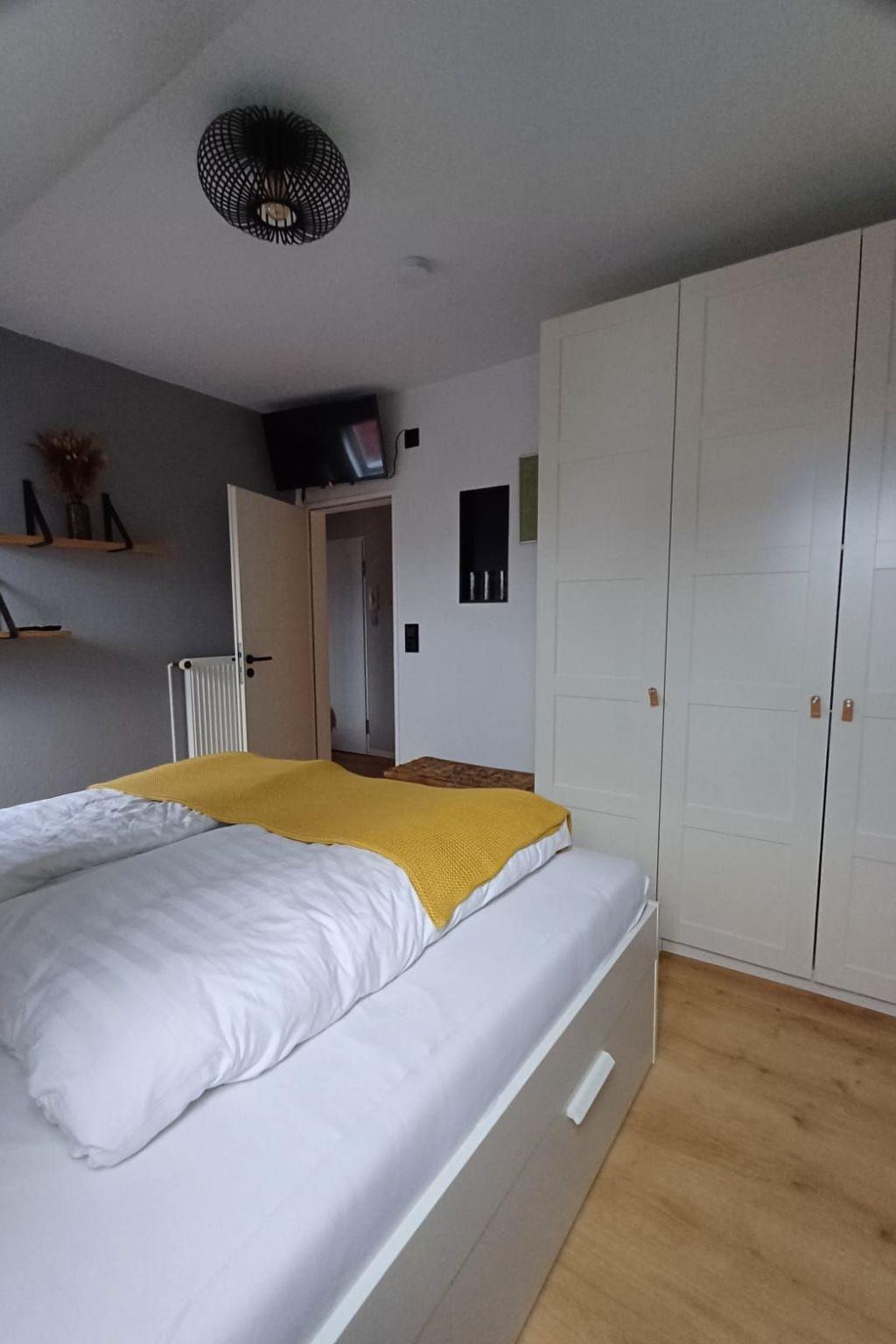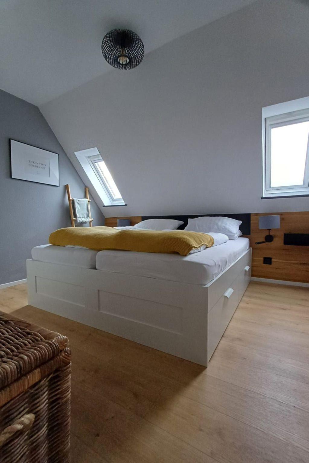 Im Schlafzimmer befinden sich ein Doppelbett (1,80x2,00m) und ein geräumiger Kleiderschrank nebst Smart-TV (Position einstellbar).